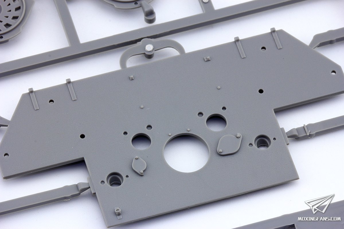 ▼ 上车体开出了扎质感的细节,焊线和切割痕的细节相对于之前的产品有所提升,更加生动了一些。但是在上车体炮塔座圈两侧各出现了一个白色的注塑顶针痕迹,需要打磨处理。