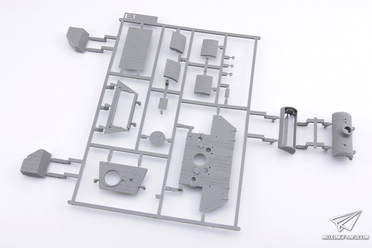 在接连推出了多款全内构豹A之后,三花(TAKOM)推出了这款豹D,而且这盒套件还是市面上很少见的附带防磁装甲的豹D后期型,在预告之初就勾起了小编的兴趣。和2100一样,这盒套件主打的还是全内构和防磁装甲,在上市之前就能从这盒套件的封绘上了解到这盒套件的防磁装甲和2100一样都是由JASON设计,而且采用了更加经典的块状防磁,鉴于之前2100防磁装甲的出色表现,相信大家还是比较期待这盒套件究竟开模如何的。 ▼ 首先是板件预览。从板件方面可以得知,大部分零件都是之前豹A中出现过的,新开模的零件主要是E3,R2和V几板。主要是防磁装甲所属的零件,发动机舱和排气管以及炮塔附属零件等,包括2种样式可选的指挥塔等。另外,套件中还提供了2套完整的负重轮可供选择。内构部分和之前开模的豹A一致,配置方面也基本一样,给出了半拼接履带和蚀刻片,以及履带辅助安装定型工具,无透明件。