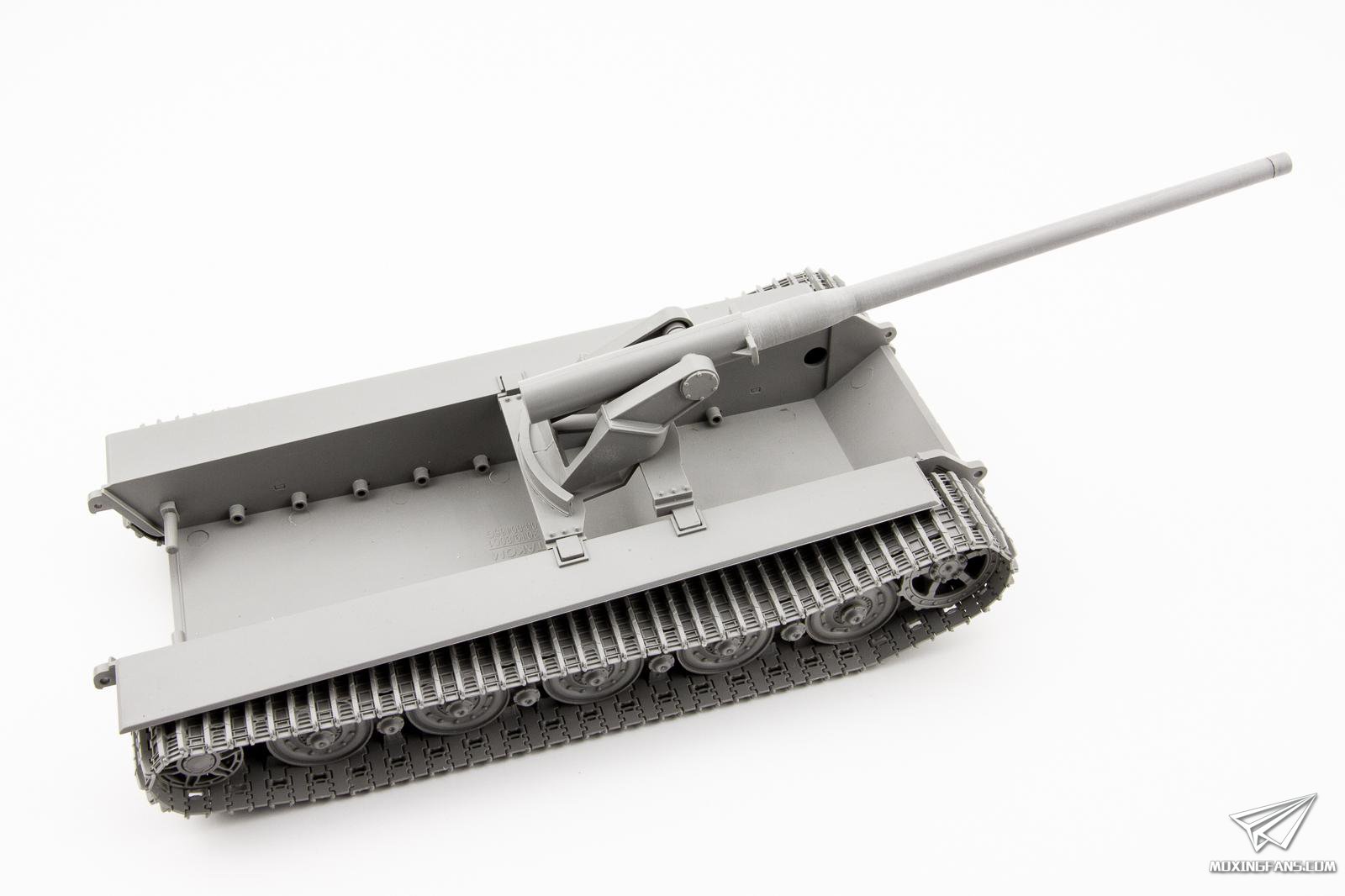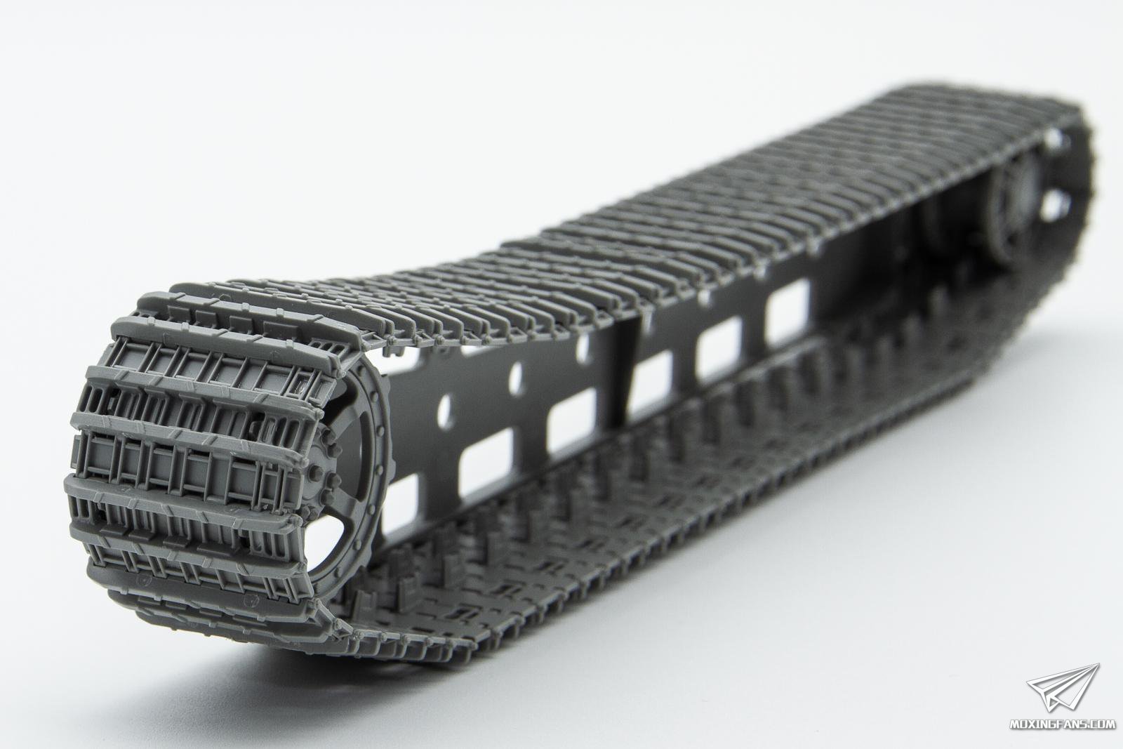 ▼ 履带为半拼接,因为有辅助工具的存在,组合起来还是比较顺畅的。半拼接履带的上半部分下垂感表现良好,唯独驱动轮和导向轮垂下来的接地面那一截并未作出弧度,看上去有些死板。