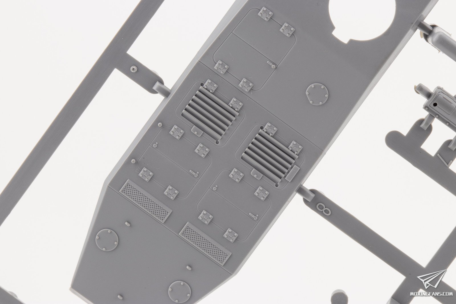 ▼ 炮塔为一体式开模,72比例的炮塔非常小巧,炮塔侧面的舱门非常小巧,一体式开出。炮塔侧面的螺栓等细节都有所体现,有合模线但是较为轻微。