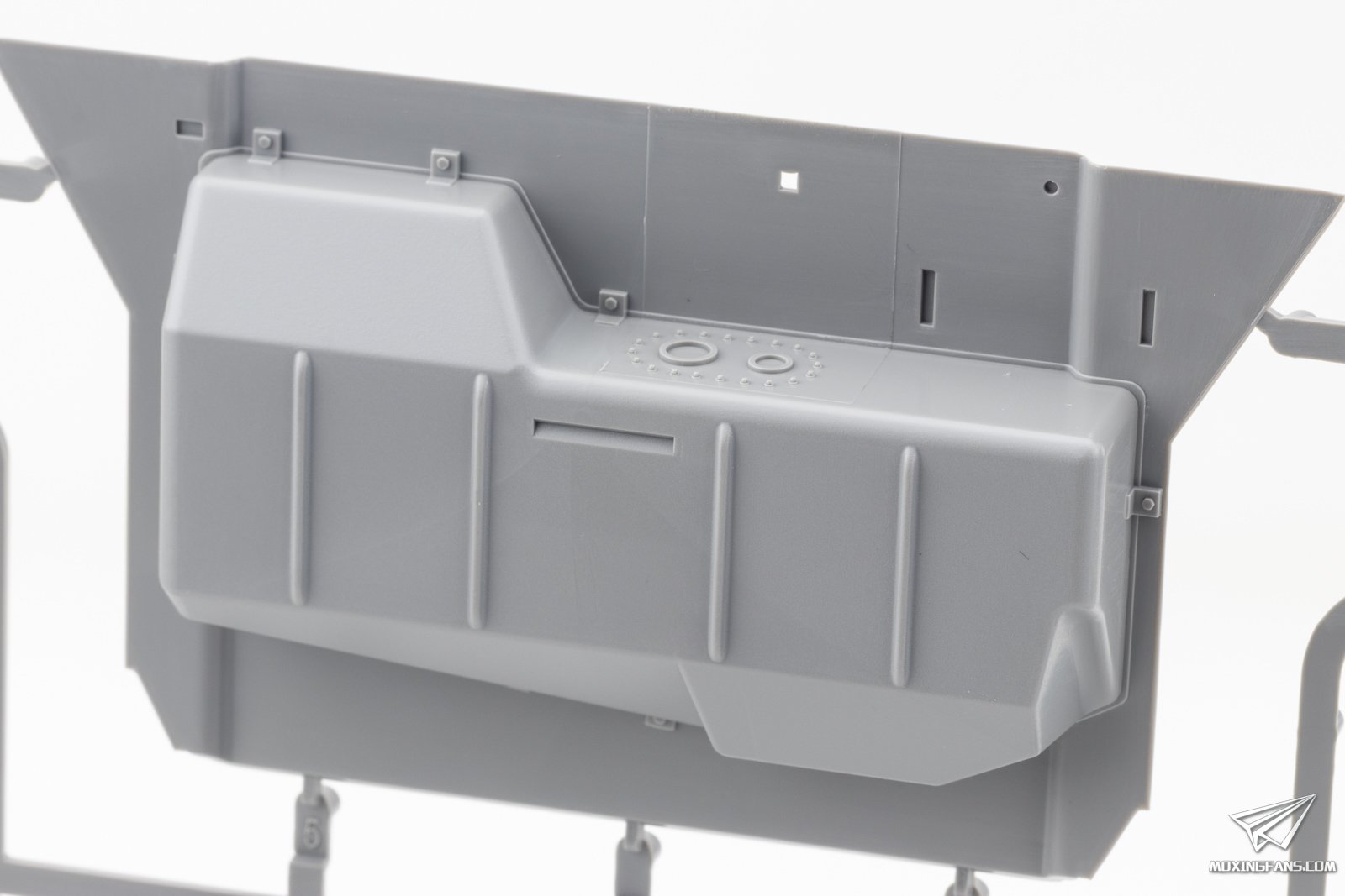 ▼ 活动履带为上下两片式结构,每片零件2个水口,无明显推出孔。销钉单独开模,使用了隐藏水口的方式,诱导齿需要单独粘接。看上去比较繁琐,好在鼬鼠车子不大,不然这部分恐怕会比较耗时。