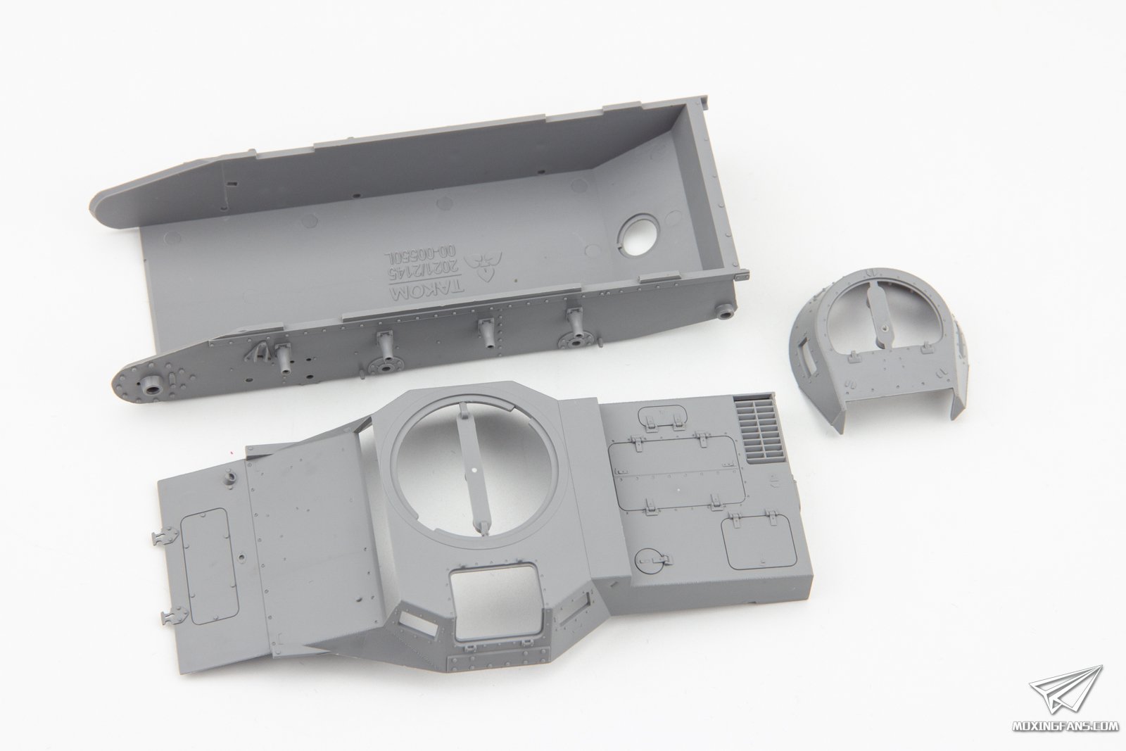由于一号A型的风冷式柴油机存在严重的缺陷,因此1935年德国武器局命令使用LK B2 样车和一号A型的部件开发新的型号,在换装了迈巴赫液冷式汽油机后,定型为一号坦克B型。B型的车体加长,发动机盖改为纵置式,每侧有5个负重轮(后4个装在平衡架上)和4个托带轮。从1935年8月至1937年6月共生产了675辆B型。其中部分车辆改装了向上排气装置并加上了空气滤清器,适合于热带气候,它被称为一号Tp坦克并配属非洲军团 。 ▼ 板件数量比A型更少,上车体、悬挂、翼子板和炮塔等部件都是全新开模,配有半拼接履带和2张蚀刻片。