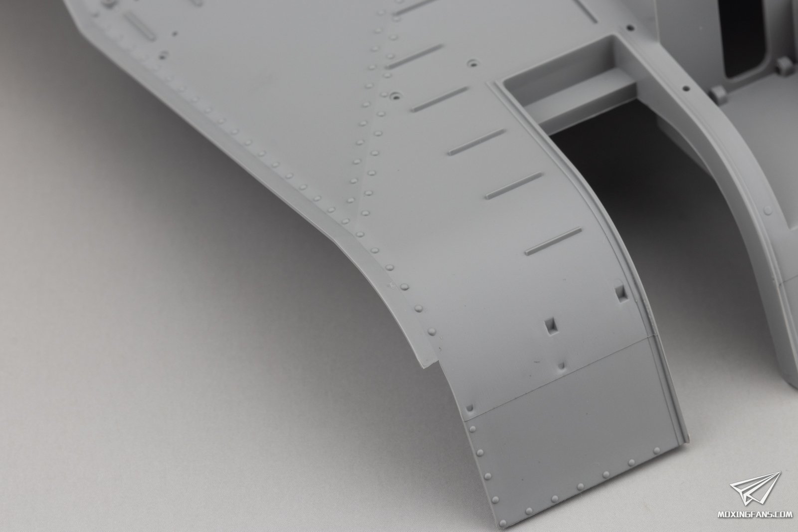 ▼ 首先来看炮塔的顶部装甲。这片装甲为一体式开模,因为是多块装甲板组合的样式,所以表面并非平整而是有一定角度的,各种折角和弧度都比较多,这部分装甲板接缝处布满了圆形的螺栓,其实是很考验开模的,如果不注意就可能造成螺栓变形的问题。从这次的零件来看,这部分的螺栓表现并未翻车,细节较为工整,螺栓并未发现明显的变形。