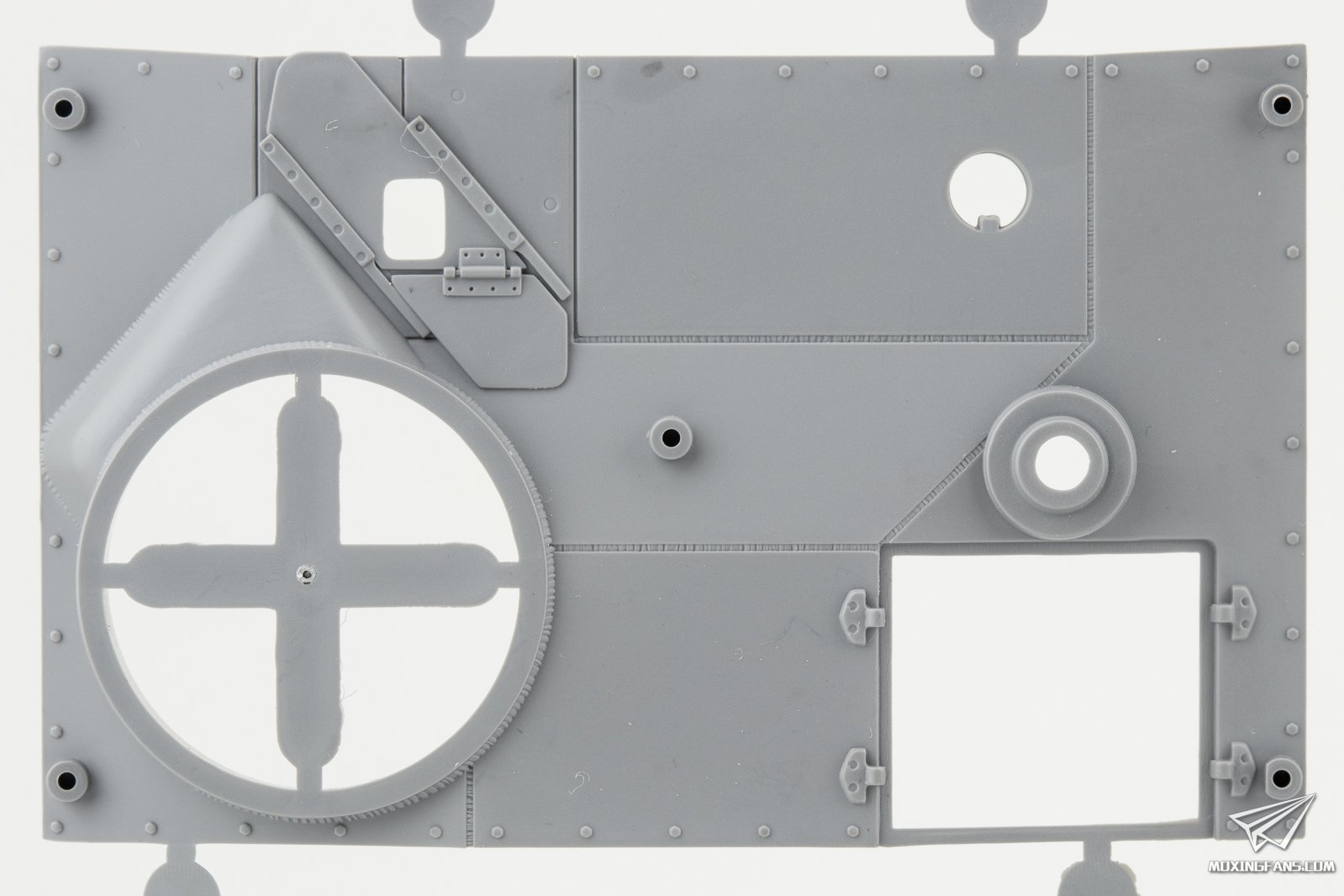 ▼ 战斗室顶部装甲以及火炮部件的细节。战斗室顶部装甲为新开模,螺栓和焊线表现的较为锐利。火炮给出了简易的炮架,炮盾则是给出了3种:初期的方形75mm焊接炮盾、后期型的75mm猪嘴铸造炮盾和后期型的105mm猪嘴铸造炮盾,铸造炮盾都开出了铸造感。火炮方面给出了75mm和105mm的射出件一体式炮管和金属炮管,105mm金属炮管没有开出膛线细节,射出件炮管则开出了较浅的膛线细节,75mm火炮和105mm火炮都给出了制退器,但是按照说明书指示105炮无需安装制退器。