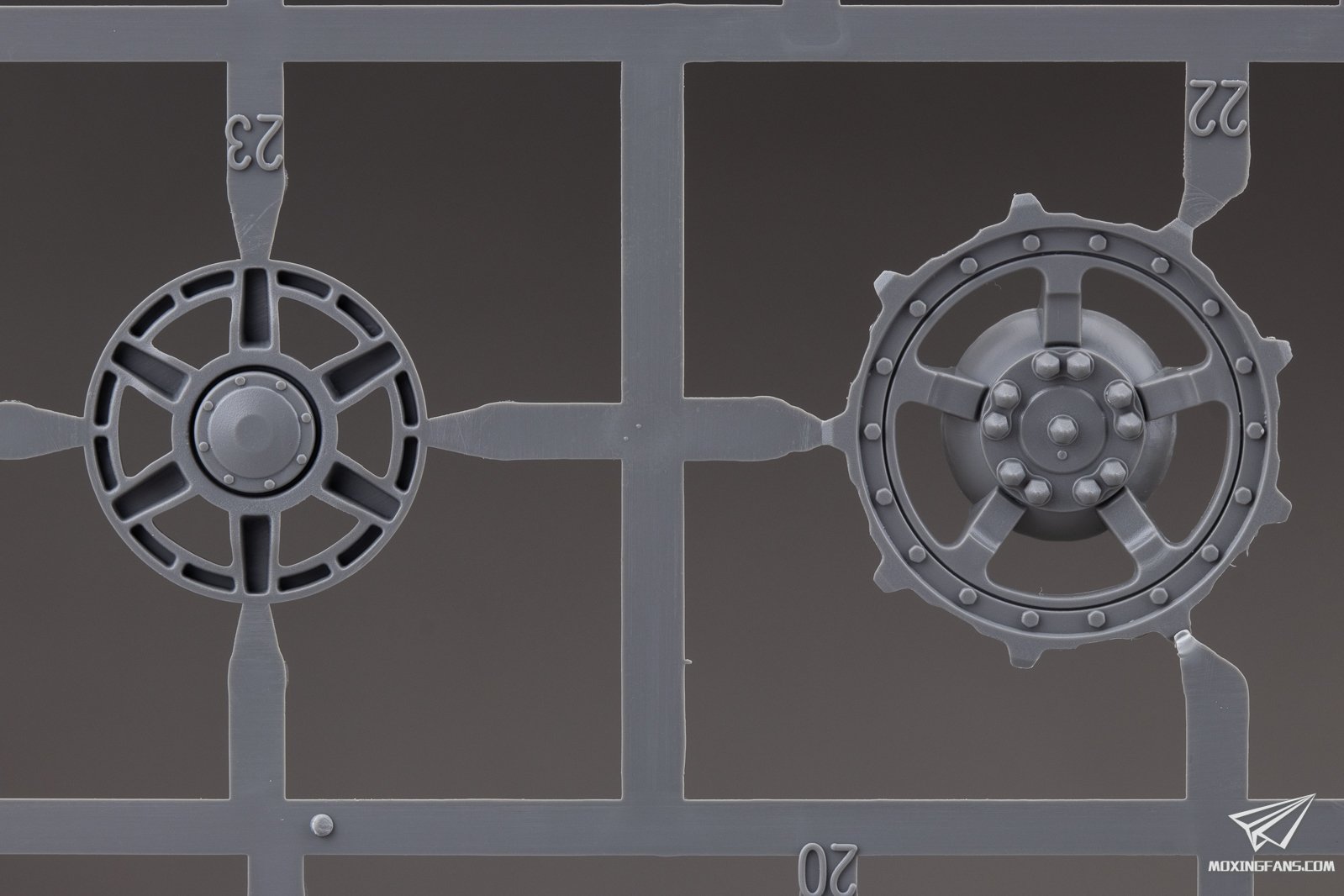 ▼ 行走部分和履带的细节,轮子上的螺栓细节较为锐利,履带为半拼接,在一体开模履带的接地面有不太显眼的推出孔。