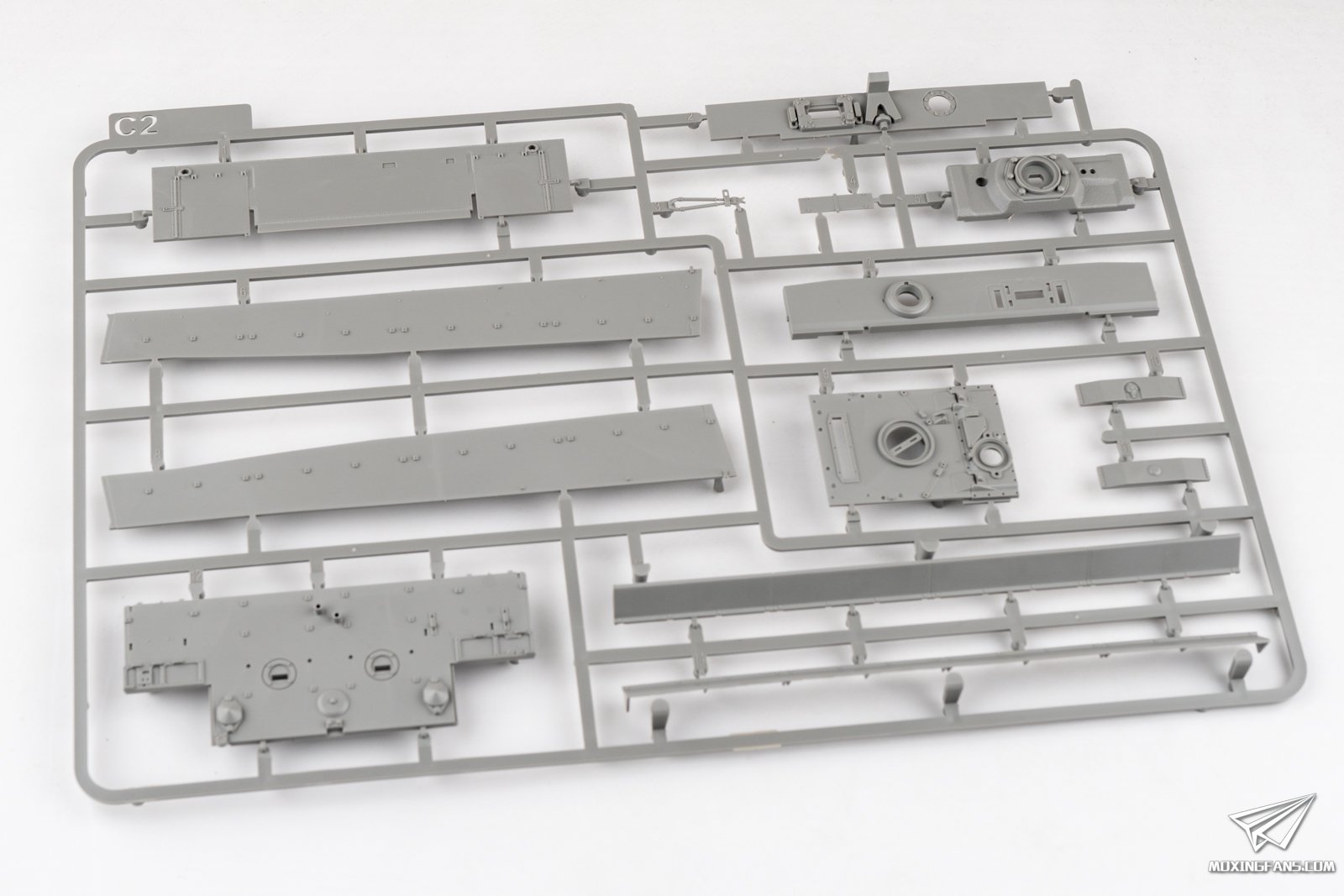 ▼ 这盒套件中大部分零件使用了后期虎的板件,E2,C2,D2,N2和两只炮塔为新开模,附带半拼接履带,蚀刻片和铝合金炮管。