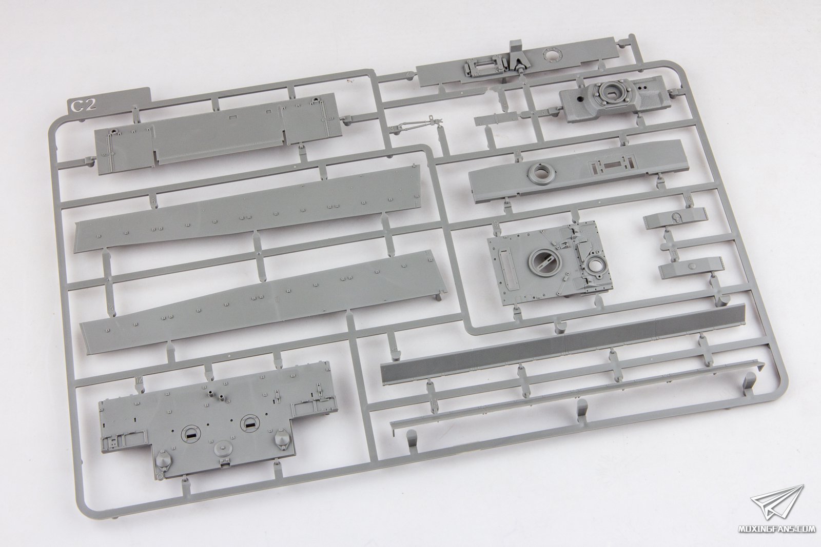 在顺利推出中期虎,后期虎和混合虎之后,三花终于把目光瞄向了初期虎,预告了两款虎式坦克初期型模型套件,今天咱们就一起来看一下这款初期指挥虎的表现如何。 ▼ 这盒套件的包装盒比之前的虎要大一圈,板件数量更多,U2、T2、V22,、W2、R2为新开模,主要是新开了轮组、战斗室正面装甲、空滤、炮塔、储物箱和炮盾等零件,附带半拼接履带、蚀刻片、铝合金炮管和1名车长人形。