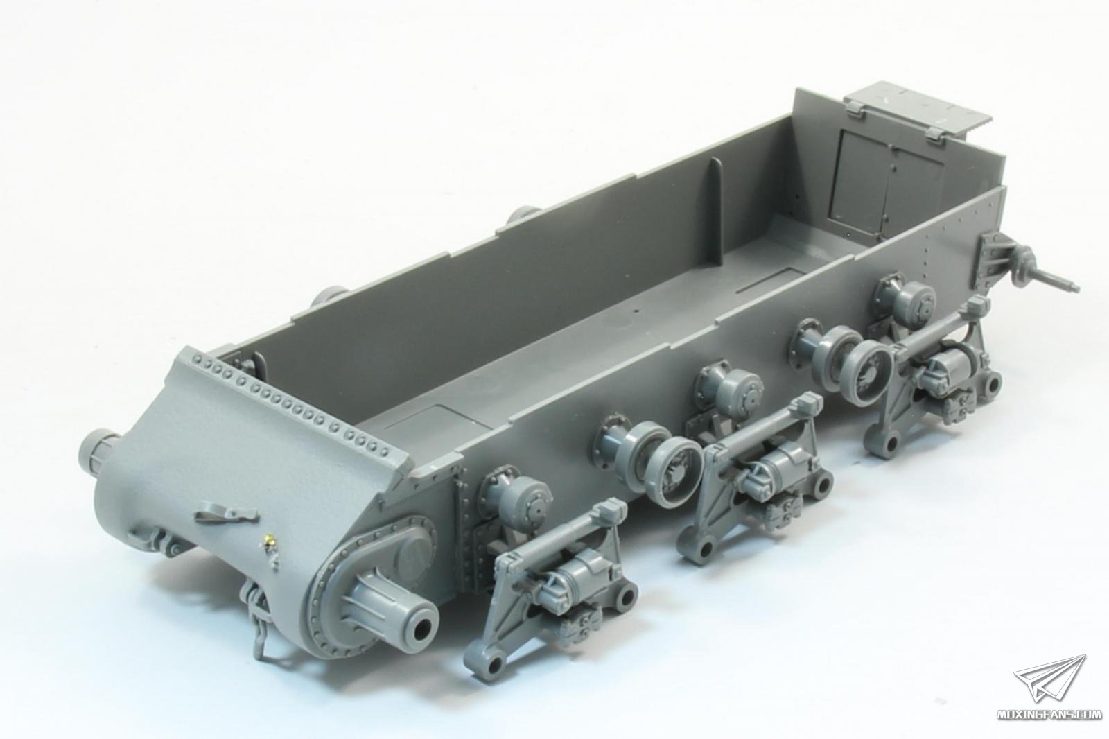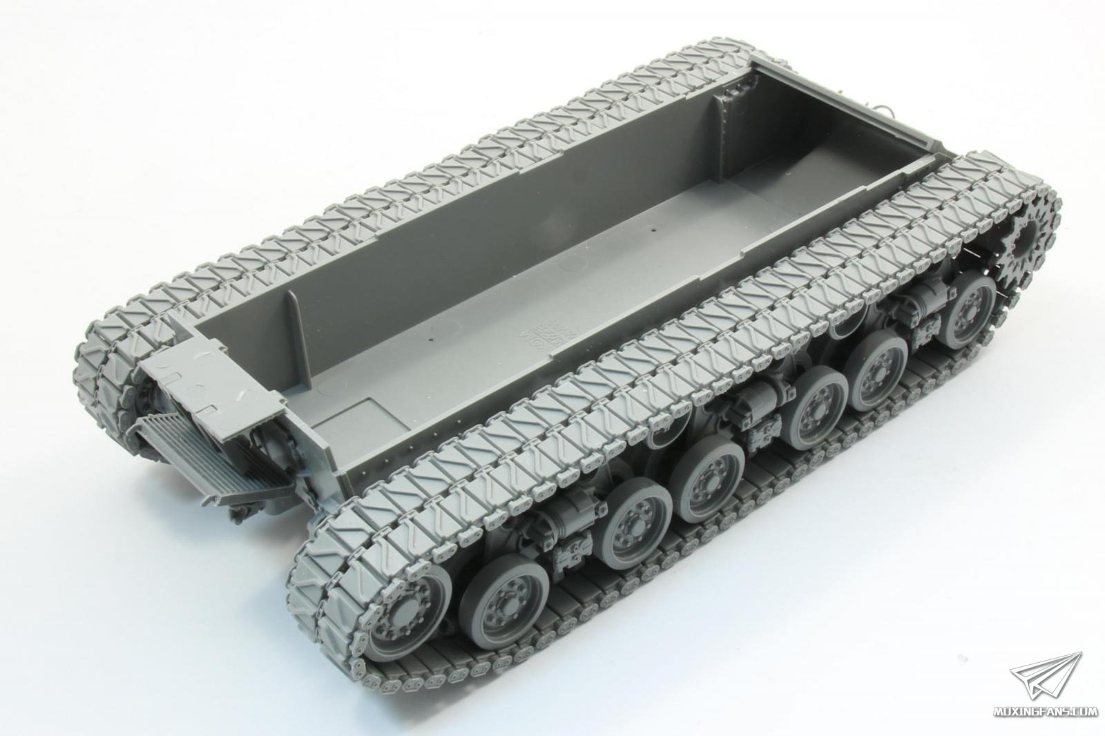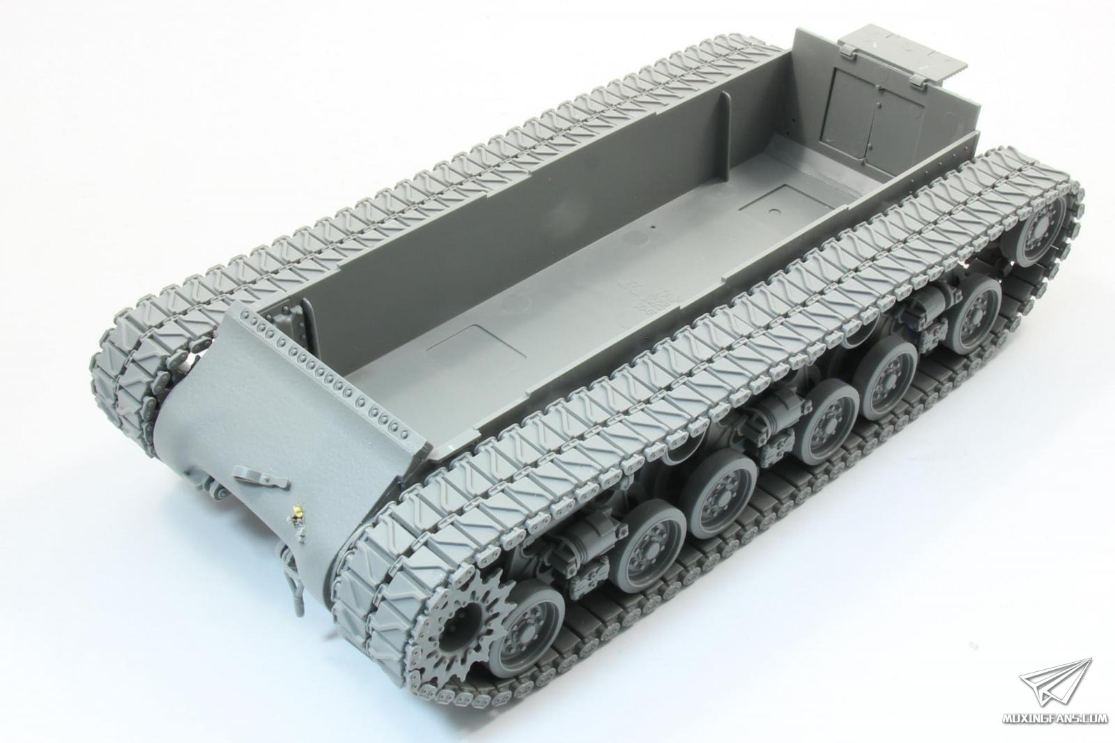 履带组装繁琐,活动性一般,看钉梢细节区分左右。内侧导齿为镂空设计并单独安装,工作量较大。