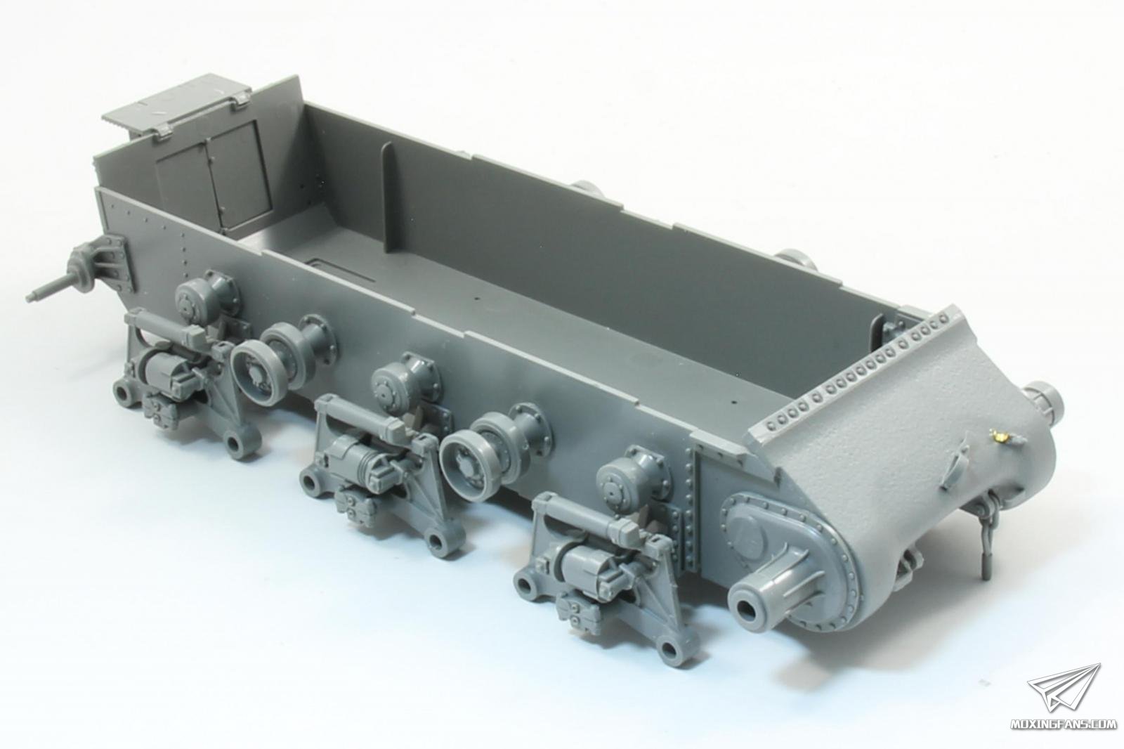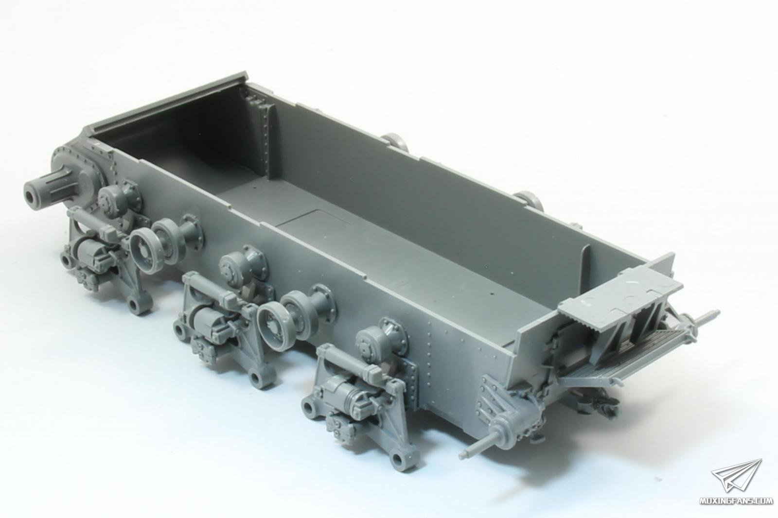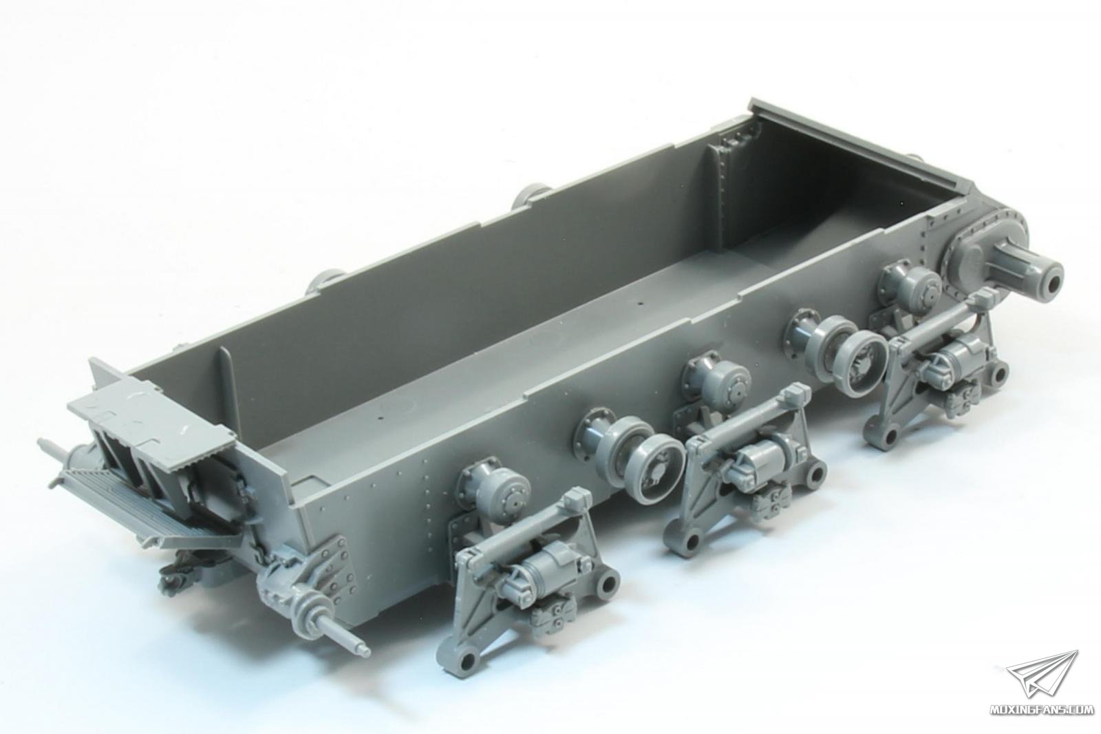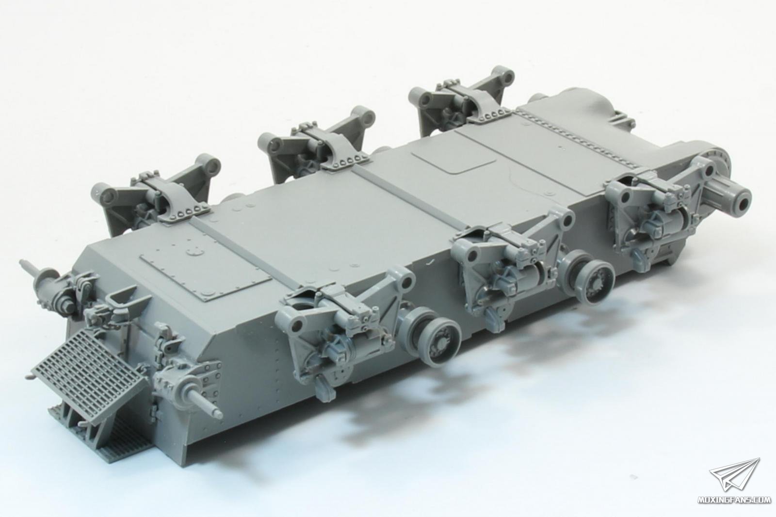 履带组装繁琐,活动性一般,看钉梢细节区分左右。内侧导齿为镂空设计并单独安装,工作量较大。