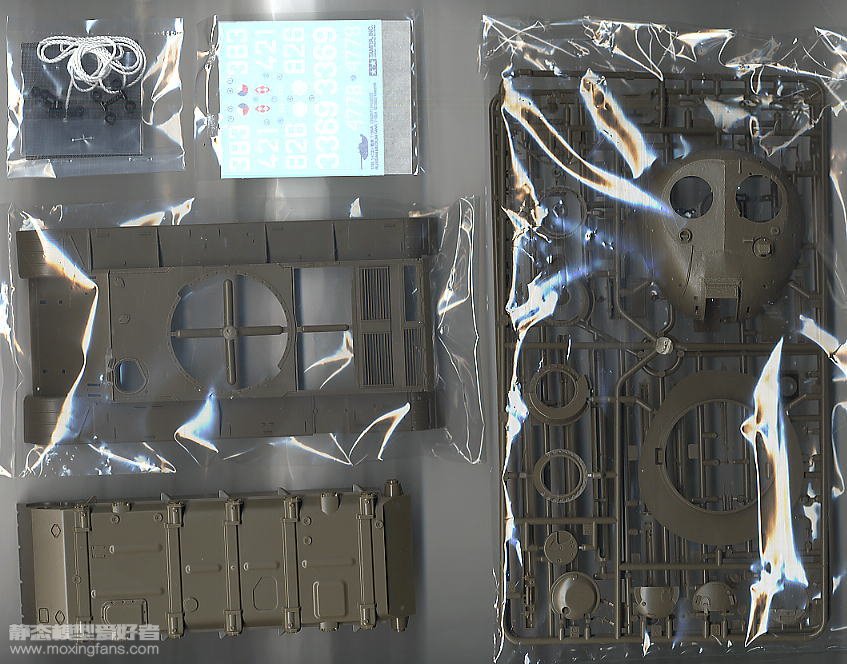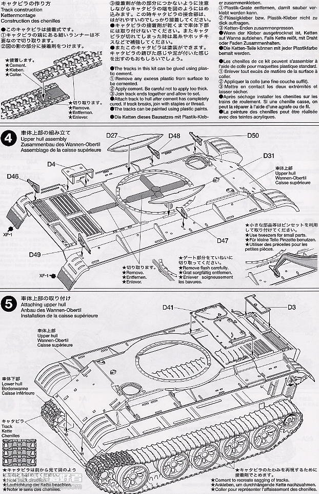 T-55是苏联继T34之后的第二款明星坦克,很多设计都非常优秀,对现代坦克也有着非常大的影响力,T-54、T-55家族共生产了超过6万辆,在很多国家都服役至今。借助WOT中城管T-54的影响力,T-55(54)家族在模友们的心中也有着崇高的地位。 田宫的T-55是田宫的明星产品,于2002年开模,时至今日,T-55的题材依旧没有厂家敢来染指,田宫的模型依旧是当之无愧的决定版。这辆T-55细节丰富,板件锐利,组合度也是一流,炮塔的铸造感恰到好处,零件开的干净利落,很多零件不需胶水都可以完美贴合。很多厂家都不重视的小零件开的也是毫不马虎,该有的细节都有,尤其是那挺高射机枪和火炮防水布,开的非常精细,让人爱不释手。当然这盒模型也有不足之处,有大神指出田宫对炮塔的考证好像有些小问题,当然这也是在所难免,毕竟T-55系列产量巨大,各种改进型号又多,出点小错误也很正常。再有就是田宫没有给这盒模型配任何PE,防爆网的PE也没有,只是给了一些类似窗纱的东东,让模友们自己剪裁,为了追求效果,小编还是建议同好们自己买一些廉价PE来补充一下。虽然模型自带的橡胶履带细节不错,但是如果预算允许,最好将橡胶履带也换掉,毕竟这样的精品配一条橡胶履带太寒酸了。 板件图和说明书: