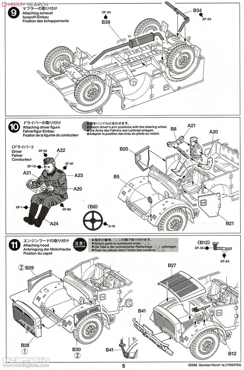 田宫的这盒1/48比例的霍希是2015年推出的新品,封绘还是一如既往的漂亮,让人充满购买欲望。就板件而言,因为是新开模而且是偏小的比例,所以开模方式比较简化,但是即使如此,还是有跟田宫自家35比例的同款模型相叫板的实力,毕竟田宫35比例的霍希实在太老了。这套模型整体开的一体化程度很高,许多细节都开在一起,零件数量很少,组合起来很快,相信两三个小时就能完成。另外,这盒霍希还附带了6个兵人,驾驶员,副驾驶和4名乘客,在48比例中细节还可以,算是比较超值了。后面有细节图,感兴趣的模友可以研究下。 板件图和说明书如下(部分来自HOBBY SEARCH):