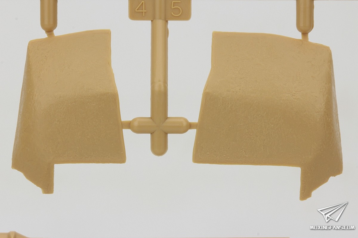 因为大部分零件都跟35197通用,所以本评测仅介绍新开模的部分,其余细节部分可点击此传送门评测参考:【田宫 35197】1/35 德国三号突击炮G早期型开盒评测 ▼ 芬兰三突有个显著的特点,就是有一部分战车的战斗室前方两侧分别加装了两块混凝土装甲。这种结构能够提升对破甲弹的防御效果,但是本身偏脆,能够提升的防御力有限。田宫新开了这两块混凝土装甲, 表面开出了混凝土的粗糙纹理。当然,如果你认为这两坨混凝土影响了三突的美感,也完全可以不安装。