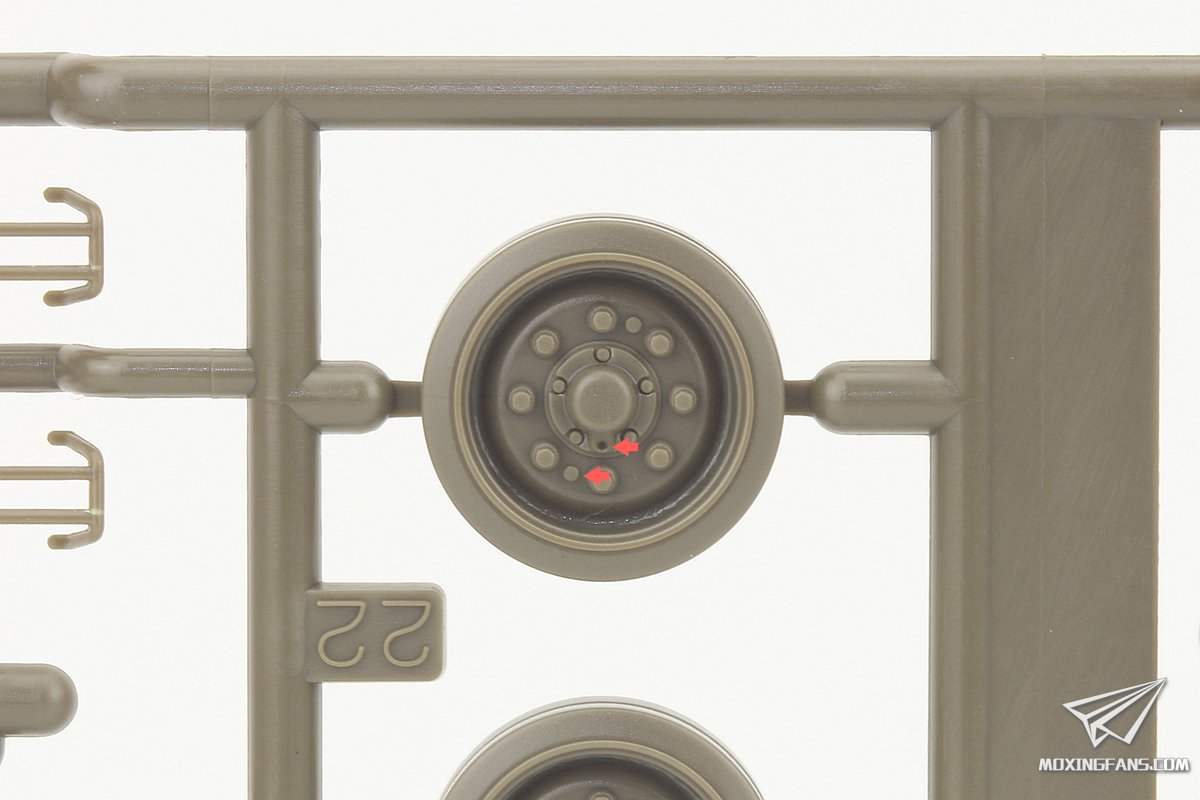 ▼ 轮子方面的细节。不得不说田宫在轮子部分对一些螺栓的开模进行了一定程度的省略,有些六角形的螺栓都开成了圆形,但是也开出了一些微小的细节,如箭头处所示。