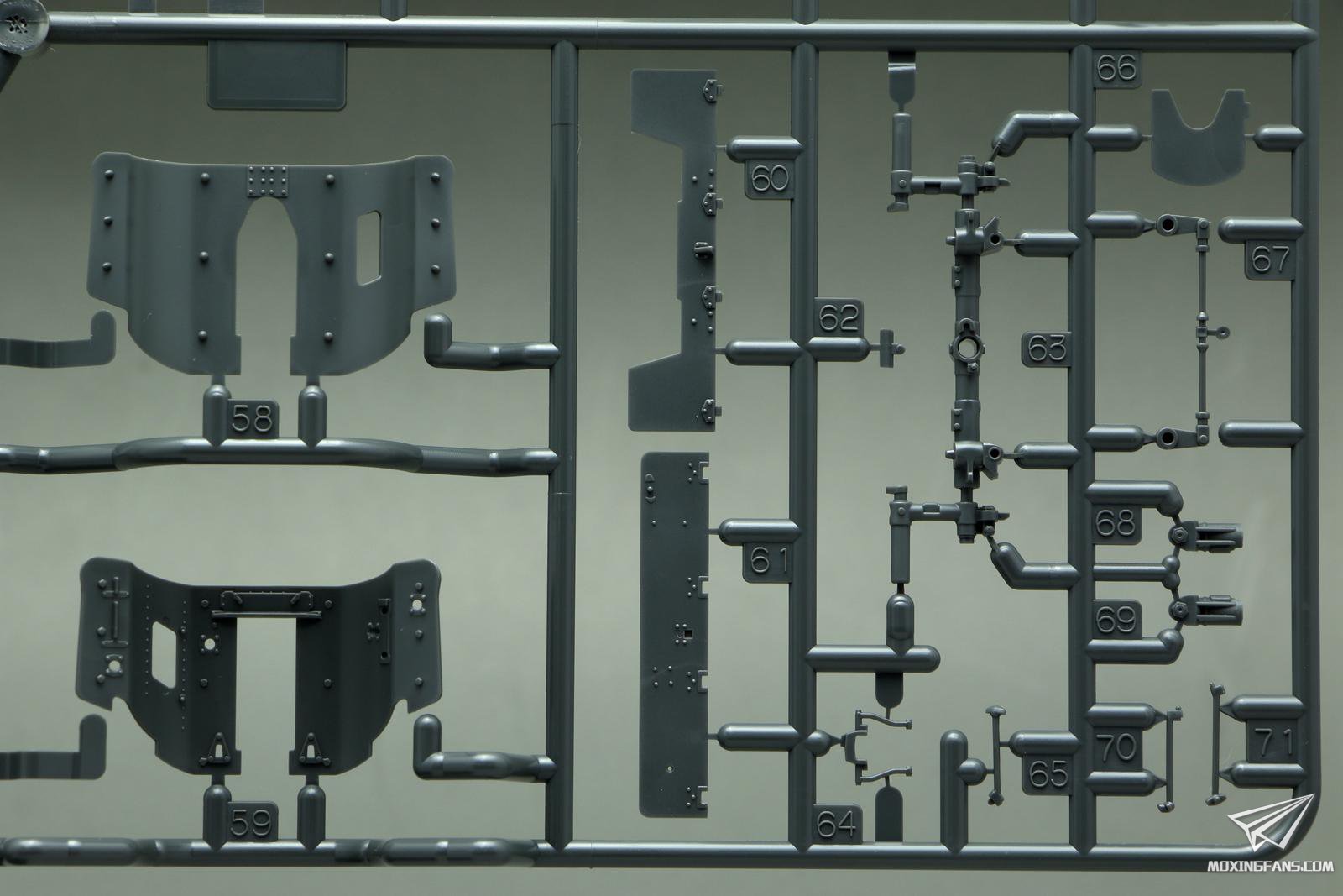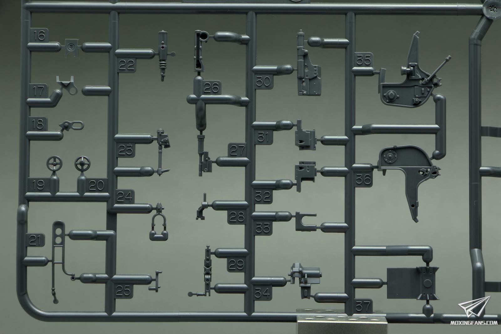 展开支架的左右腿都已经标明,非常细致。炮体的主体结构开模一体化程度很高,很多细小零件都开在了主体结构上,开模工艺很田宫,制作过程一定很愉悦;主炮炮身为一体开模,但是炮口消焰器部分需要左右合体粘接。