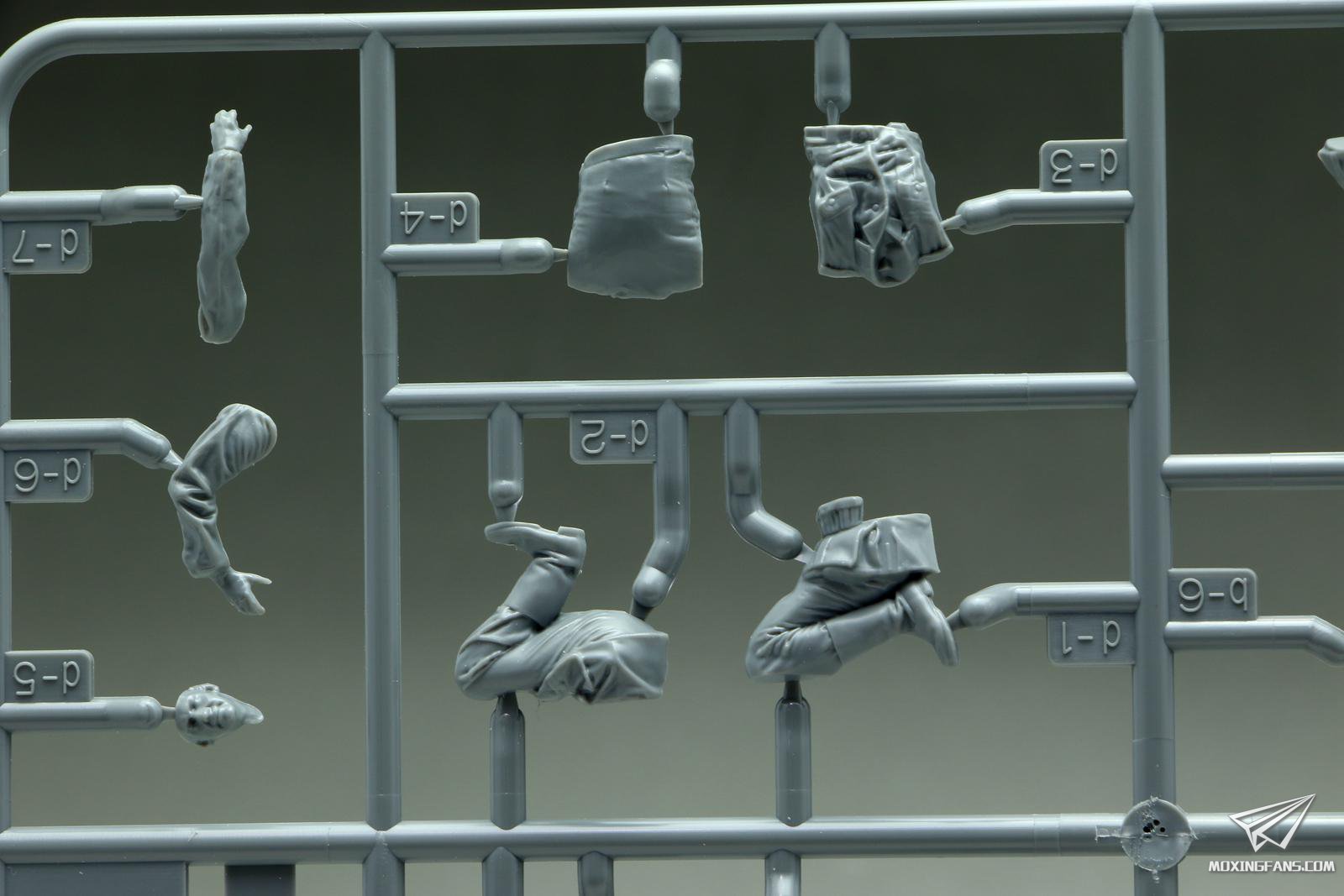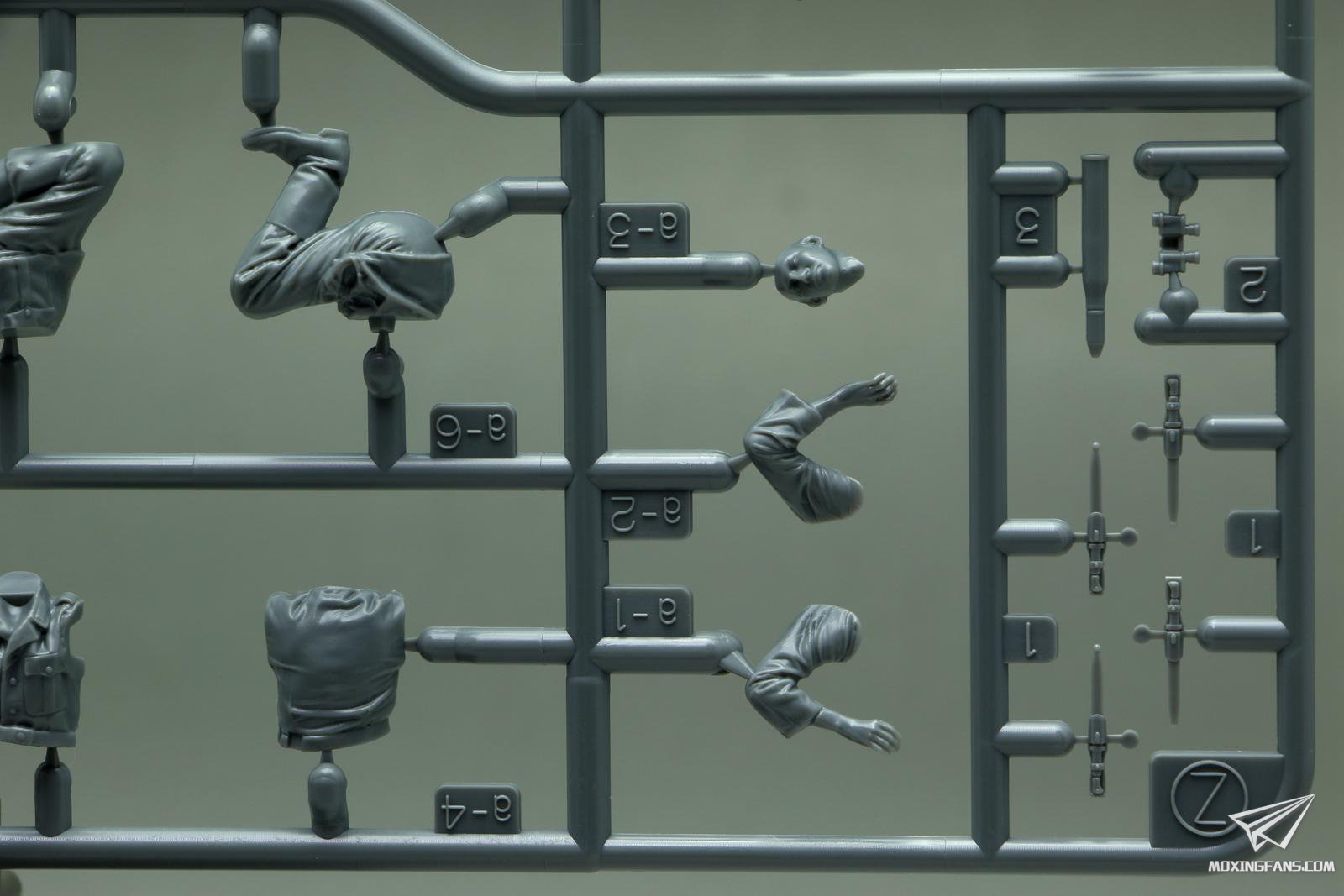整套发射组成员采用了蹲姿,所以衣物上的褶皱痕迹是比较重的,这点在兵人衣物开模上就看得出,特别是裤子部分折痕刻线很深,后期通过渗线和干扫就可以获得非常不错的明暗对比效果。 人物表情脸的刻画也是很自然和应景的,手掌的手指部分也开模犀利,在衣物安装手枪和匕首部分预留了粘接空位。可惜没有给出军衔等水贴比较遗憾。