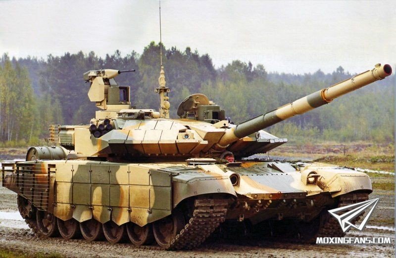 俄罗斯 T-90MS 主战坦克“塔吉尔”,作为 T-90S 型的升级型,于2011年首次亮相。原型最早在2012印度防务展(Defexpo 2012)上展出。T-90MS 坦克出口版本配备了1130马力V-92S2F型柴油机和一个改进的变速箱,设有7个前进挡和一个倒挡。还配有一个辅助柴油发动机,当坦克静止时,用来提高燃油效率并减少热量释放,从而减少T-90MS 被红外探测(发现)的几率。