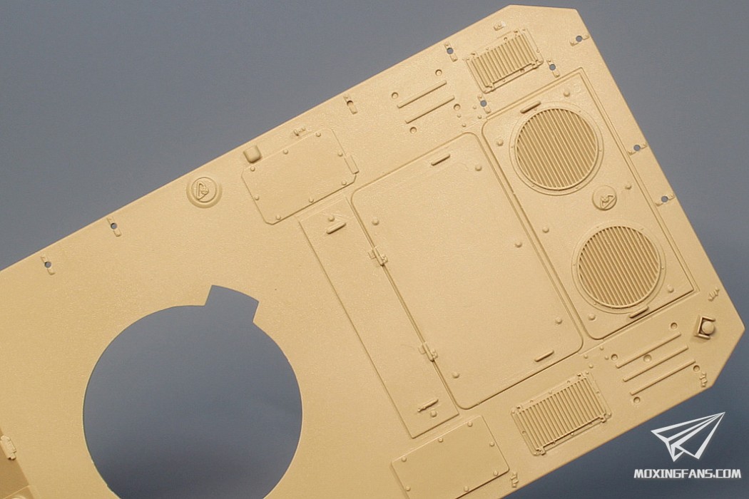 车体装甲,细节尚可,使用了隐藏水口的方式,只是隐藏水口开在零件正面,后期处理起来对于新手有些难度