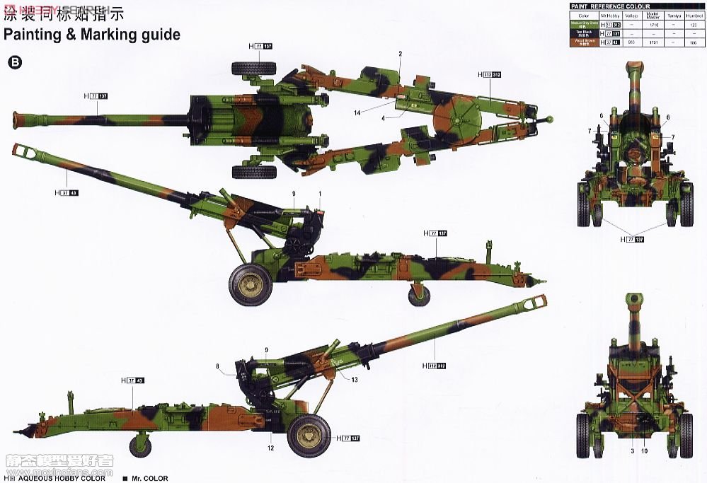 M198型榴弹炮是美国石岛兵工厂1968年开始研制的牵引式榴弹炮,1979年开始装备美海军陆战队并出口。目前美国每个海军陆战队师有3个炮营,共有54门该型大炮。M198型榴弹炮射程远,威力大,机动性好,重量轻,可空运,是一种适于直升机运输且具有较好战略机动性的新型火炮,用于全程火力支援和直接火力支援。 该炮全重7.1吨,由于大量采用轻金属,使全炮重量比同口径火炮轻1吨多。炮弹射程22公里,高低射界-55度至+72度,最大射速4—6发/分。在野外条件下,更换身管只需30分钟。在伊拉克战争中曾对伊坦克和装甲目标发射了90发炮弹,命中率90%以上。可发射多种炮弹M198牵引式榴弹炮配用远程榴弹、发烟弹、照明弹和黄磷弹等弹种,其中用爆破杀伤榴弹时最大射程达到25.7公里,可安装反装甲/反步兵双用途子母弹,弹内37枚子弹,每枚装有57克炸药,末段有飘带,子弹拖着飘带平稳落下,引爆后可击穿100毫米厚的装甲,并产生大量碎片杀伤敌有生力量。由于其内膛结构符合北约弹道标准,因而可发射北约其他国家的同口径制式弹丸。M198牵引式榴弹炮还可发射“发射后不用管”的一种子母弹,主要用于打击装甲目标,该弹的最大射程为30公里。M198发射系统改造后可以接受5射区MACS,改造项目已于2005年12月全部完成。 作为美军的现役明星装备,M198的名气还是非常大的,经常在电影和电视中看到它的雄伟身影,相信其粉丝也不在少数。小号手的这款M198算是小号手众多模型产品中非常不错的一款,其开模合理,零件数也不多,组合起来也比较轻松,细节也还可以,配有简单PE和橡胶轮胎,组合好后有很多可动部件,可玩性也是很不错的,更加难能可贵的是价格也非常合理,只要不到百元的价格,性价比非常高。后来小号手还出过一款M198前期型,只更换了几个小零件,不仔细看都看不出来,而价格却贵了一大截,所以不建议买前期型。这款火炮可以做成发射状态和运输状态两种,不管是做炮兵阵地场景还是使用卡车拖曳都很合适,是美军党必收的一款模型。 板件图和说明书: