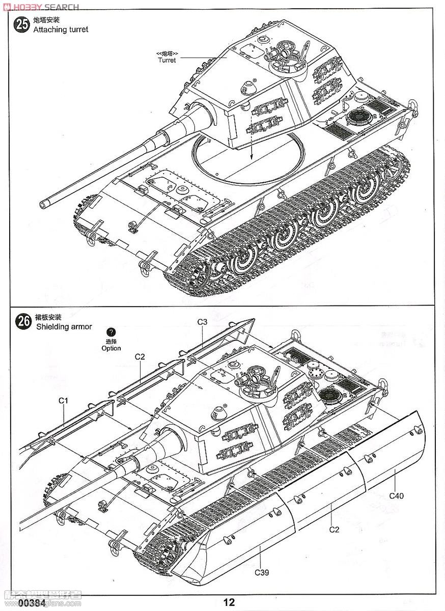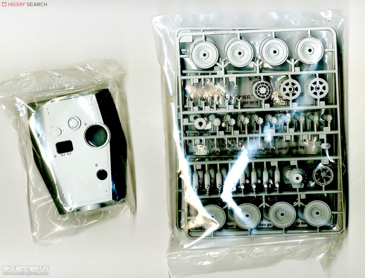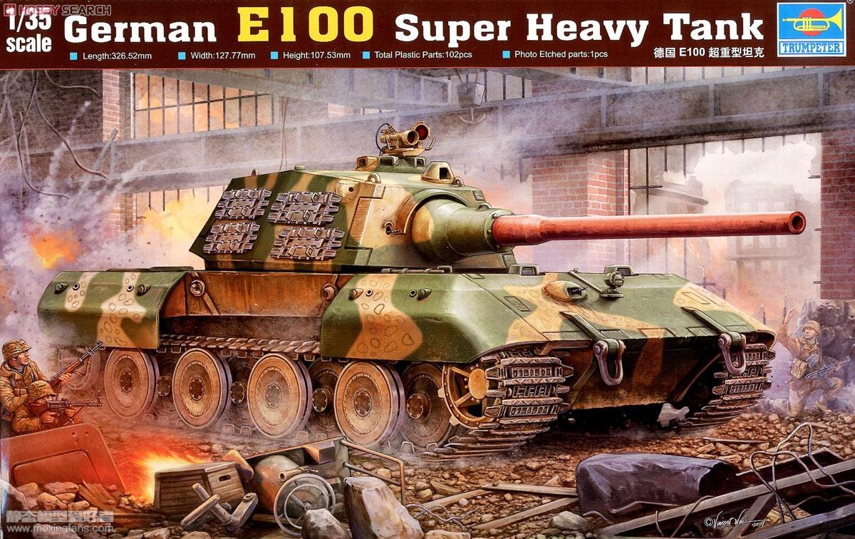 小号手的这盒E-100是2008年前后推出的,是一款不折不扣的题材货。E-100这个题材是一个非常热门的图纸车,作为德军末日战车计划的最后一型,是无数德棍们必收的一款。而且伴随着WOT的逐渐流行,喜爱这辆重达140吨的无脑粉也绝对不在少数,然而市面上只有威龙的E-100这一款型号,而且还是不是的断一下货,这盒E-100卖的还是挺不错的。当1945年盟军缴获这辆战车时,元首早已终止了E-100这个不切实际的计划,落入盟军手中的只有一辆没有炮塔的战车地盘。 所以,这辆没有炮塔的战车留给了后人太多的想象空间,据资料,E-100有3种各有特点的计划炮塔,分别是鼠式炮塔(威龙),克虏伯炮塔(坦克世界)和亨舍尔炮塔(小号手)。由于开模较晚,所以小号手的这盒E-100相对威龙的老货的细节还是略好的,但是和现在的新品相比细节还是差不少,因为零件数量不多,组合度也不错,不需要完备的考证,所以这方面也没有什么要喷的。配置方面给出了一张防爆网蚀刻片,橡胶履带。以前这盒模型要小两百,如果降到125的价格还是挺不错的,相信拿来和三花的128防空炮改造百运的模友会不少。 板件图和说明书如下(部分来自HOBBY SEARCH):