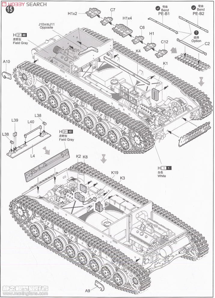 小号手的这盒四号坦克维修车是2009年推出的,和威龙的同款6438是同一年,那些年的威龙和小号手也是有一段故事的。。。不扯故事,说板件。小号手的这盒四号维修车也是花了心思的,套件中800多个零件,2大张蚀刻片,拼接履带(减重孔镂空),板件还是很精细的,新开路轮开出了焊缝和胶轮的厂家,车体上的焊缝和铆钉开出了相应的细节,而且是全内购,很多细节相对于小号手同时代的其他模型上是想都不敢想的,只卖180,和威龙不带内购的6438价格差不多,谁敢黑我大号手和他没完! 然而,即使如此,小号手这盒全内购的高性价比四号维修车依旧卖的不好,总结原因有几个:1、考证问题:托带轮错误,四号维修车使用的是钢制托带轮,封绘上还是钢轮,但是套件中却是胶轮,照搬了四号D/E的零件;木质起重机横梁木纹细节缺失;这是一辆非战斗车辆,但是图纸仍然给出了炮弹和弹药架的组装,虽然缺乏考证资料,但是正常人都知道这货没火炮,带这么多炮弹是几个意思?2、开模问题:板件上或多或少都有些飞边和毛刺,虽然处理起来并不困难,但是印象却不好;很多零件开的过于厚,比如发动机的风扇,排气管的开口等等,厚度快赶上装甲的厚度了。3、组合度和细节问题:40CM履带细节不错,但是由于定位问题,组合起来极其容易一条弧线而不是直线;发动机和变速箱小零件极多,而且定位不明,组合过程需要多假组,和车体的组合度也很一般,需要多次定位;机枪无法穿过防盾的开口,只能换掉或者自行把孔钻大;全车的铆钉看似细节很好,但是基本都是圆形的,肉肉的感觉;相对威龙,仍然缺少细节,已有的细节也不锐利。 板件图和说明书如下(部分来自HOBBY SEARCH):