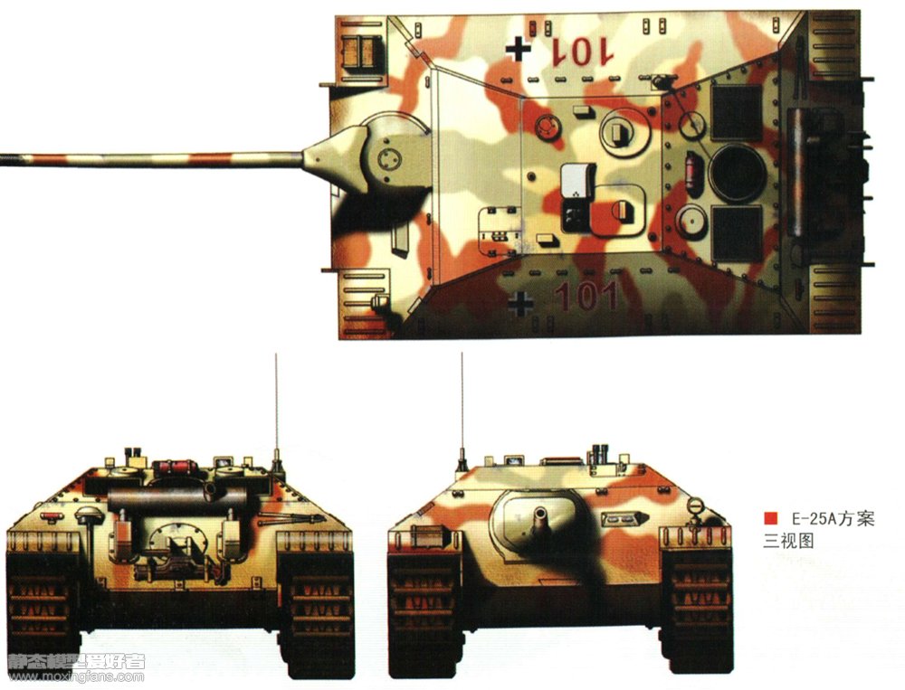 1944年11月27日,在陆军武器局第6处的默许下,计划中安装71倍径的88mm坦克炮或是70倍径75mm坦克炮的Sd.Kfz.162/3被直接改称E-25。 整体而言,此时的E-25完全变成了E-10的放大版本,结构上按照后者的125%进行放大(主要是通过增加一个负重轮,延长了车体,增大车内空间和底盘的承载能力),并且动力、传动、悬挂系统等部件直接取自E-10。 具体来说,E-25战斗全重27吨,乘员3人(驾驶员、车长、炮长(装填手));动力/传动装置后置,整个车体从前向后很清晰地分为战斗舱和动力舱两部分; 一门备弹量达57发的KwK 43 L/71 88mm坦克炮,或是备弹量74发的KwK 44 L/70 75mm坦克炮被置于前部战斗室的首上装甲板上,防盾外装(但位置沿车体纵向轴线偏右约35cm); 400马力的迈巴赫HLl00引擎、液气扭杆混合悬挂系统、履带以及1000mm直径的负重轮都是E系列的标准件(也有资料称,保时捷也有计划为E-25安装700马力的迈巴赫HL230P30,传动装置采用“奥尔瓦”401216B型机械式变速箱(有8个前进挡和4个倒挡),以与现有的“黑豹”或是“虎Ⅱ”实现通用); 车体外形则与E-10大体一致;首上装甲板由四号70(V)型坦克歼击车的80mm削减到60mm,车体侧装甲板厚30mm;出于为战斗室提供更大空间的目的,首上装甲板倾斜角度由E-10的30度调整为45度,虽然此举导致车体增高,但E-25的车高还是保持在与四号70(V)型坦克歼击车一个水平上。 E-25在设计上其实并没有多少新意——E-10的放大版本就足以说明一切,实在是乏善可陈。或许是保时捷博士本人也意识到了这一点,于是在推出了被称为E-25A的“基础方案”后,又推出了一个高配置版本的E-25B。与E-25A相比,E-25B之所以被称为“高配版本”,除了首上装甲板厚度恢复到80mm,并安装了一个颇有看点的车长周向指挥塔(在这个可360度旋转的单人指挥塔中,安装有一门内置30mm机炮作为辅助武器),配备“食雀鹰”或是更为先进完善的“猫头鹰”红外夜视瞄准具。