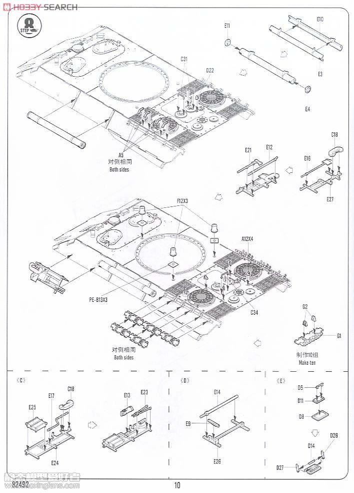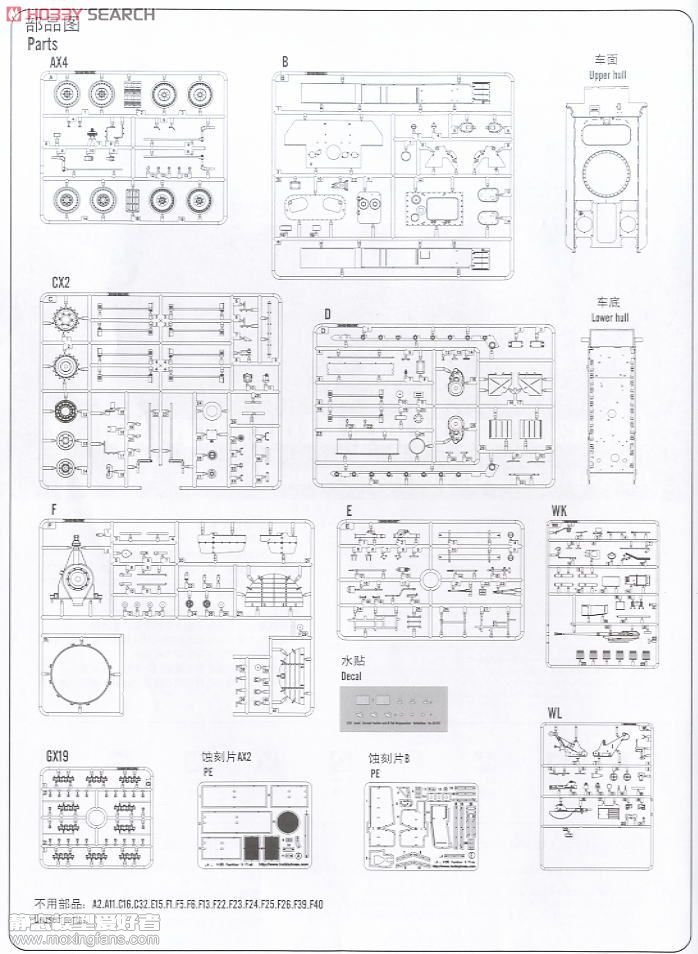 HOBBYBOSS的这盒豹式坦克防空炮是2012年推出的,这个题材的豹子其底盘使用的是豹D的底盘,炮塔拆除之后安装了一门FLAK37 37mm高射炮,算是很不错的题材货,如果威龙要出的话肯定是白盒了。就配置来说,中规中矩,配置拼接履带,3片蚀刻片倒是比较抢眼(蚀刻片A有2片)。就板件细节而言,也是比较一般,细节处显得有那么点肉肉的感觉,扭杆悬挂设计的不错,拼接履带正面反面都没有推出孔,但是每节履带有4个水口,休整起来比较麻烦,底盘为豹D,但是HB却给出了后期型履带,小编有点不解,是为了表现战争后期资源匮乏造成的拼凑窘境?车体的焊线都有所体现,但是效果差强人意;37炮的细节也比较肉,要求高的模友最好更换金属炮管;木质盖板开出了木纹效果,但是比较粗犷。总体而言,这辆豹子的细节整体偏肉,近两百的售价也偏高,这可能也是为什么小号手开出豹D底盘之后却没有进一步研发后续产品的原因吧。 板件图和说明书如下(部分来自HOBBY SEARCH):