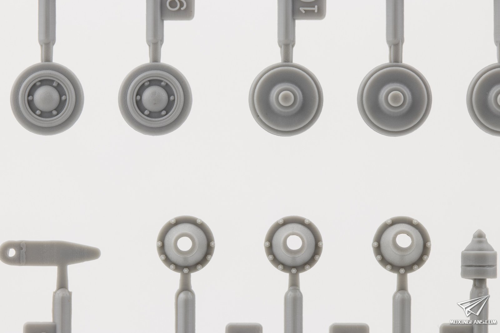 ▼ 套件为固定悬挂设计,负重轮上的焊线有所体现,大部分螺栓的表现不错,小部分零件有飞边现象。