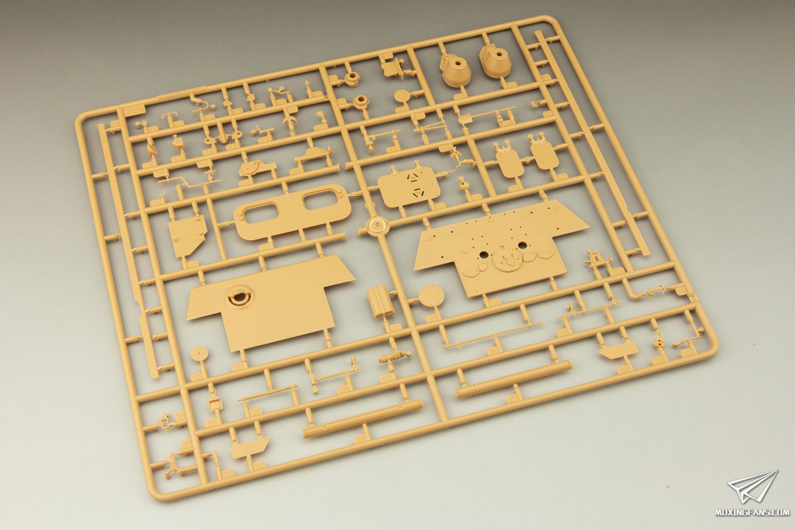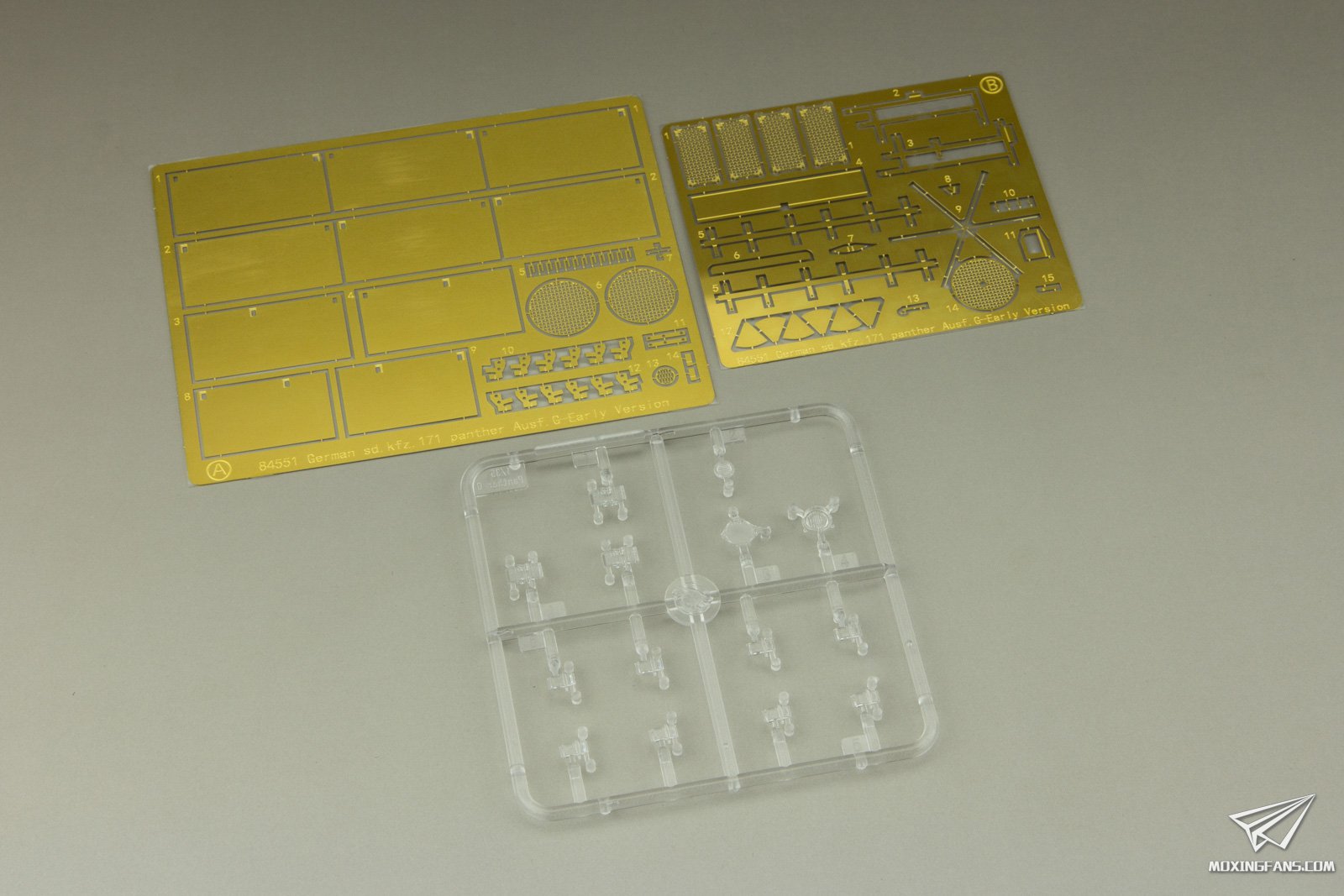 不得不说黑豹坦克是一个特别经典的题材,在田宫、威龙、三花、麦田、MENG等海外和国内大厂都曾经推出过相关的1/35比例套件,而且衍生型号也比较丰富,在厂家的眼中是一个叫好又叫座的题材。这些年不怎么涉足二战德国装甲题材的小号手/HOBBYBOSS开始逐渐推出热门二战德国题材,先后推出了虎王、虎式等多款套件,而且不少产品的表现都不错,下面我们就来看看这款新上市的黑豹G初期型表现如何。 ▼ 板件为黄色PS塑料,配有拼接履带和2片蚀刻片,带有不少内构部件,包括完整的变速器、炮塔内构和完整的扭杆悬挂等,补充上驾驶室、战斗室内构和发动机结构就算是全内构了。