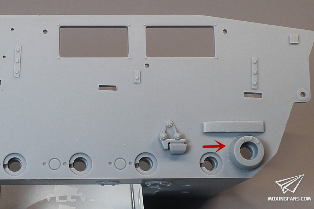 负重轮胶圈做出了文字浮雕,反面的六角螺栓也开出了来了,细节还比较锐利,负重轮内圈是否应该有焊接纹,不得而知,如果这个负重轮沿用到虎式坦克上面的话,应该是有焊接纹,其他厂家有做出这个细节