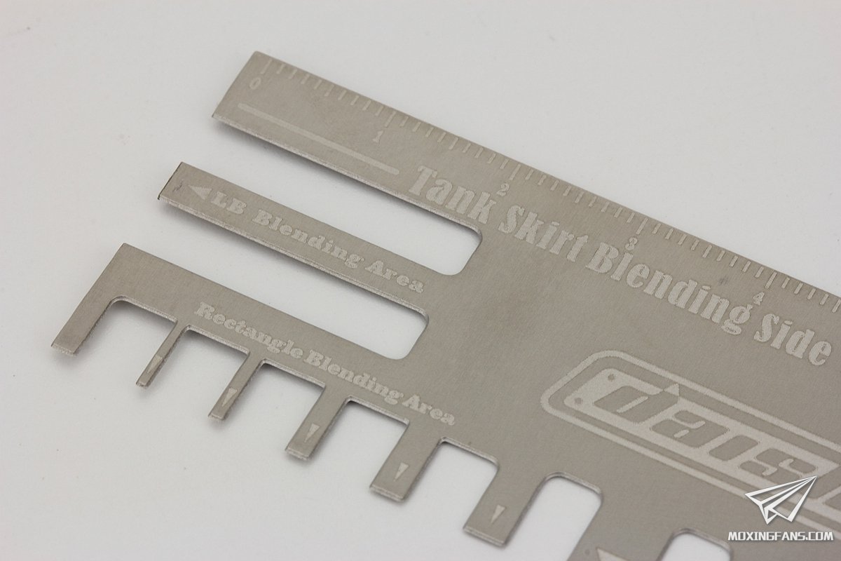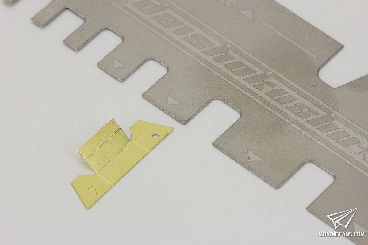 ▼ 弯折尺上面开好了多达21种规格尺寸的弯折工作部(工作齿),可以应对大大小小的各种规格的蚀刻片,从正规的方形到三角形一应俱全,甚至还包含了45度的情况,非常齐全。更加值得一提的是,其中的较长直边部分还刻好了刻度,在某些时刻还能够拿来做临时的直尺使用,很贴心的设计。