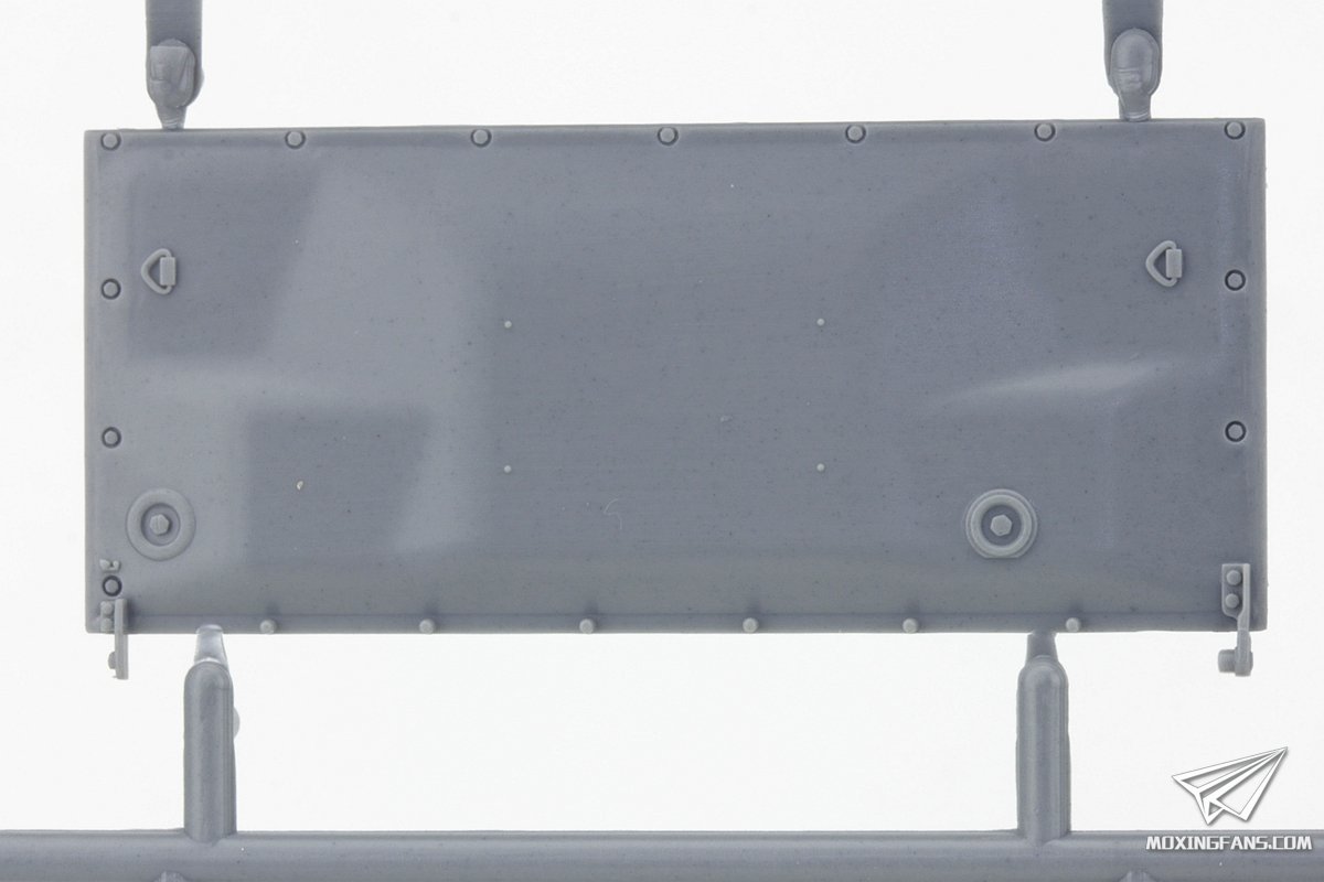 ▼ 首上位置的车灯灯架为滑块开模一体式开出,但是零件周边有些许飞边,看上去不是很清爽,好在处理起来并不繁琐。俄系战车的灯罩形状较为复杂,一体式开模能够大大降低处理的难度,相信做过拼接式灯架的模友都会会心一笑。