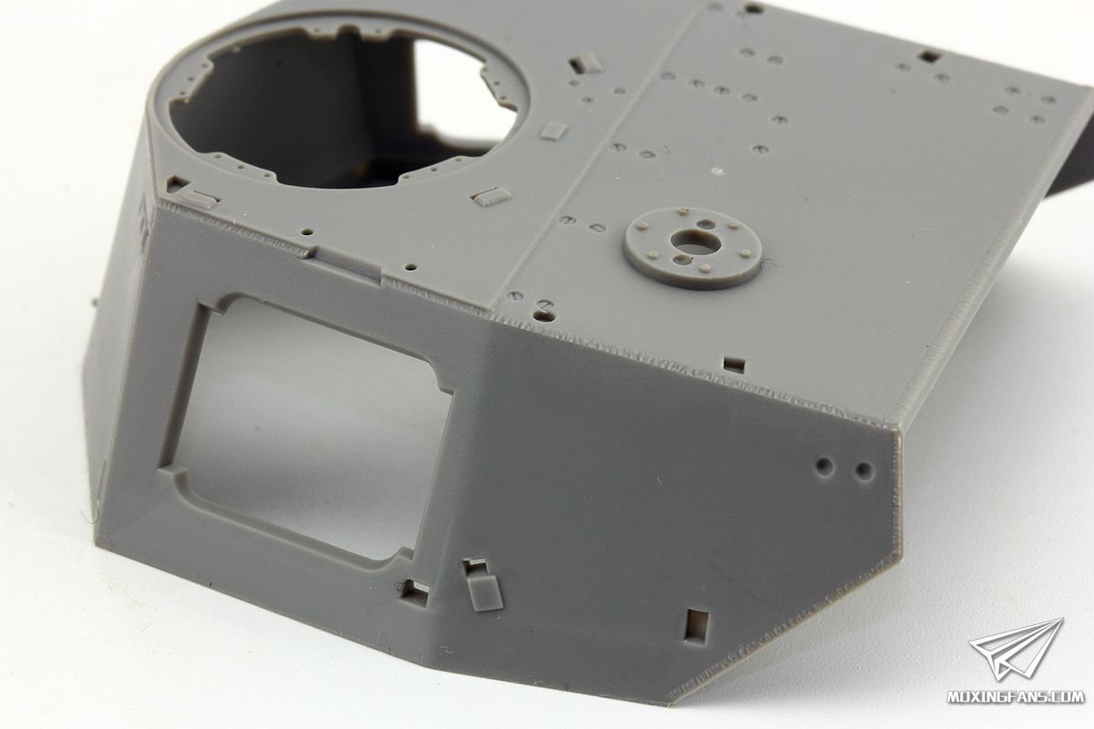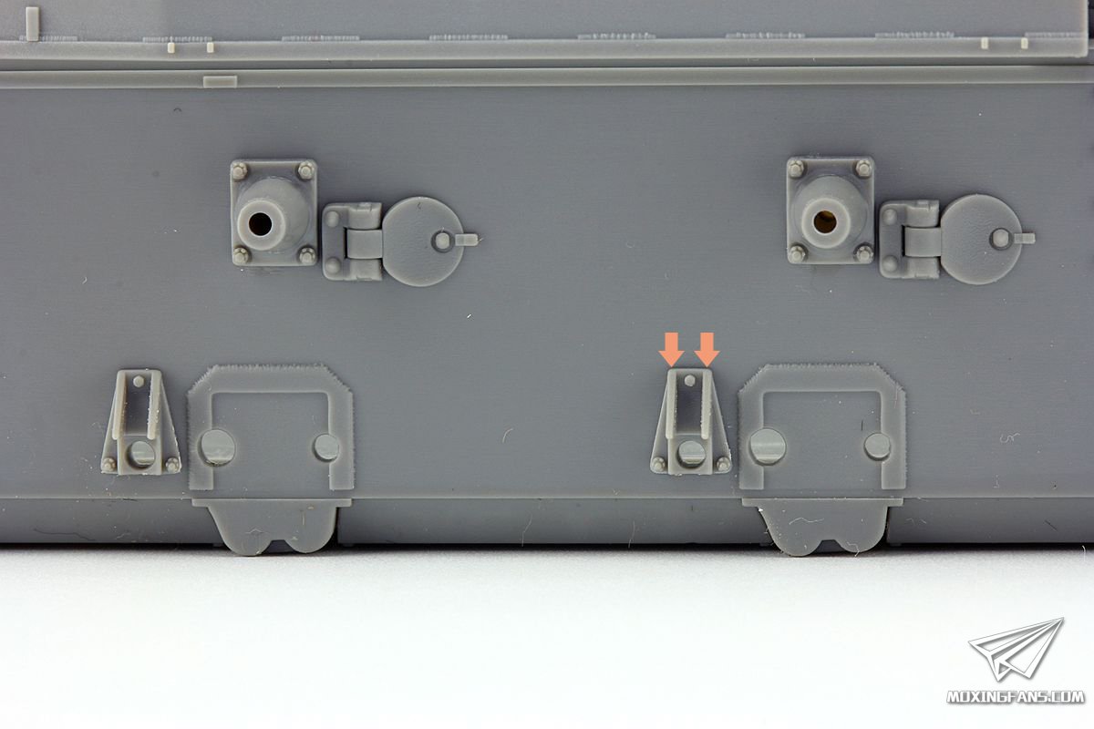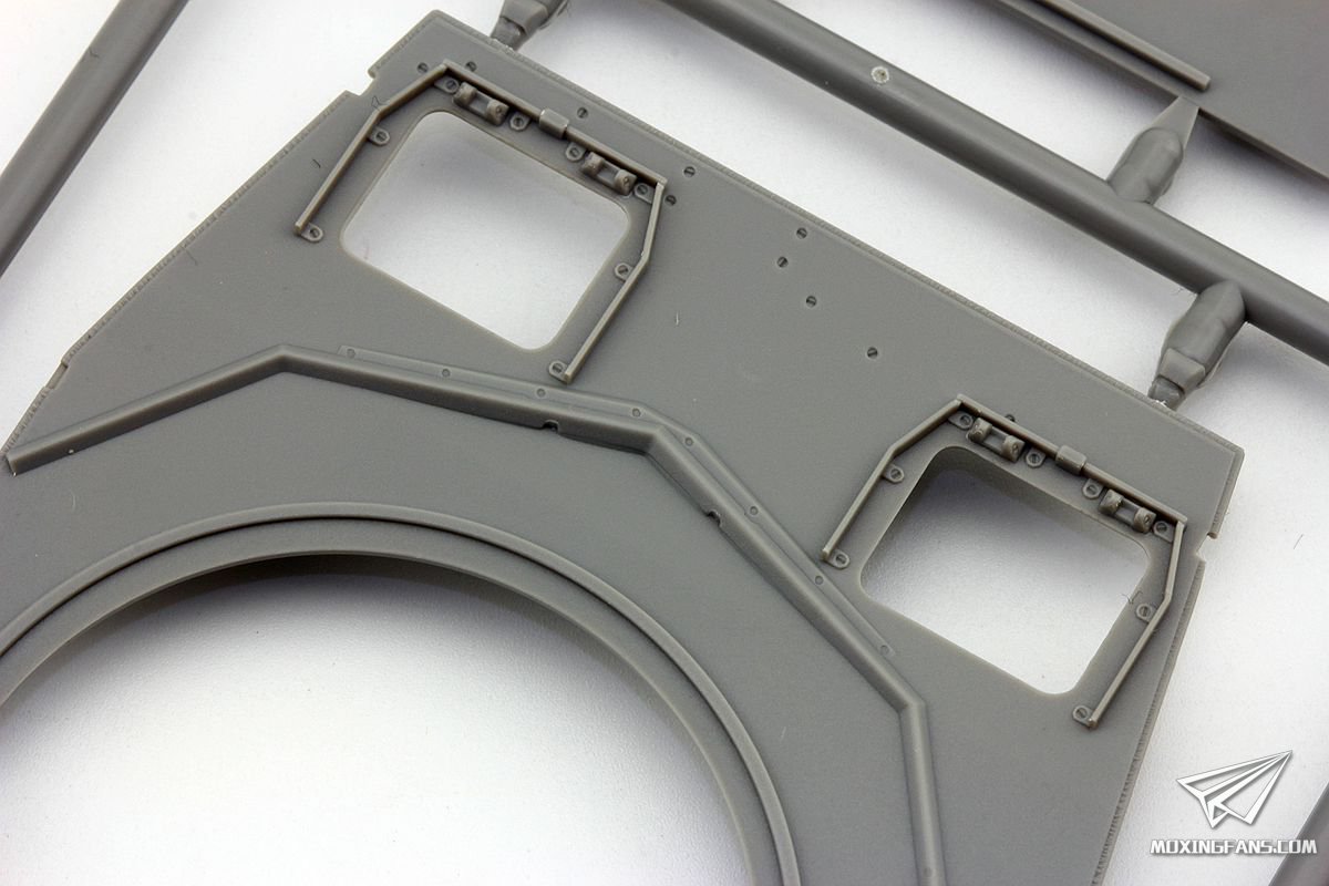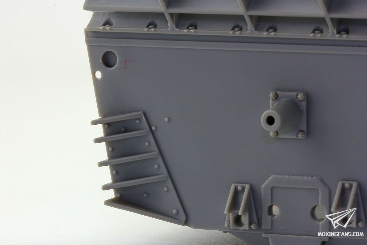 ▼ 上车体顶部装甲为单独开模,车体四周的焊线细节表现不错,车体尾部的发动机盖板的细小螺栓都有所体现,埋头螺栓的朝向也并不统一。