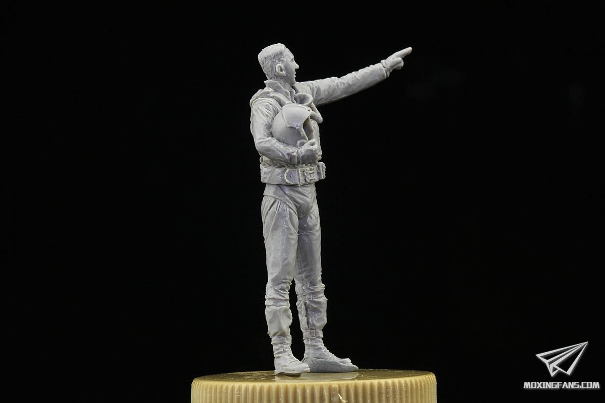 ▼ 站姿飞行员的细节。兵人的姿态和动作都较为自然,身着飞行员制服,怀抱头盔,面部表情非常自然,手指前方显得踌躇满志。衣服的立体感非常棒,褶皱感也较为自然,头盔的厚度非常薄,在这种比例的兵人中如此厚度的头盔制作起来还是有不小的难度的。