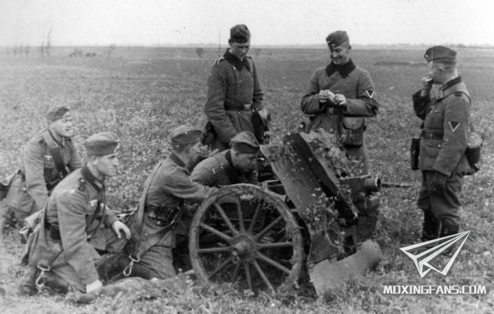 1939年时德国开始大量生产这种火炮,早期型为木制轮子,不利于汽车拖曳,后来改为橡胶充气式轮胎,行驶平稳性也增加了。在同年9月,有3000门进入德国国防军服役,是一线部队拔除火力点的有力武器。