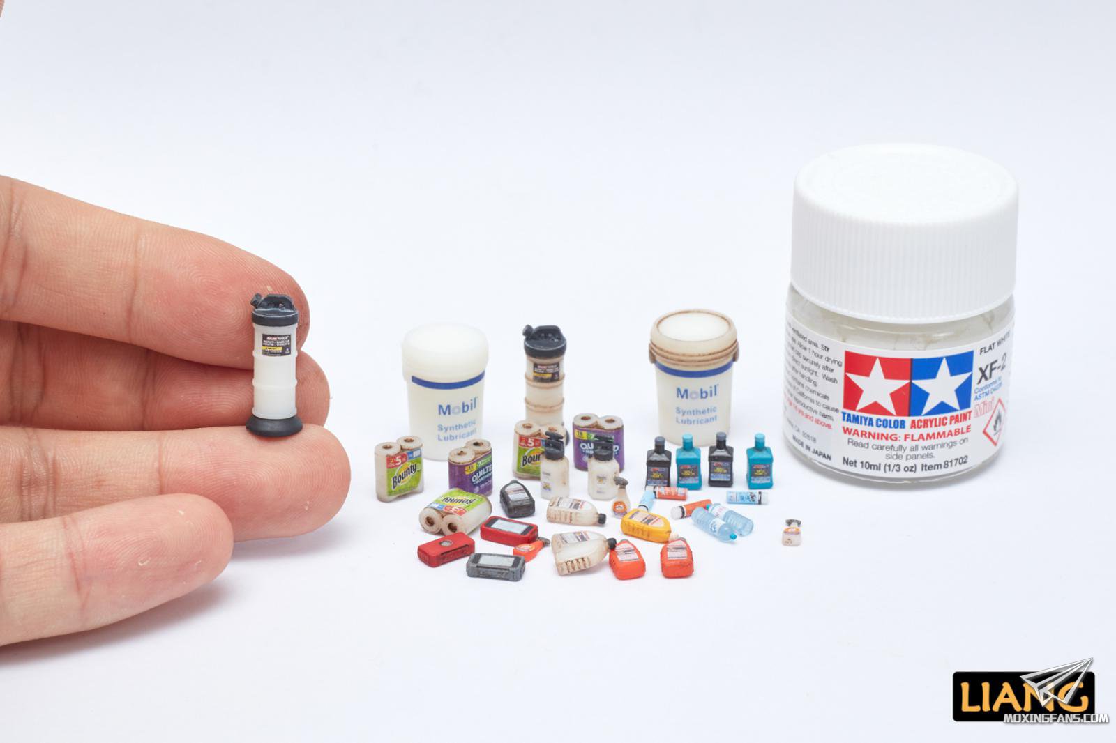 包装盒上封面展示了套件的涂装效果和旧化效果,产品特点如下: 1.套件内包含一板3D打印件和一张水贴。 2.板件包含清洁剂、扫把、饮料瓶、机油桶、易拉罐、油泵、车载电脑、塑料桶等物品。 3.板件为白蜡材质,接近塑料质感,海绵砂纸轻微打磨,无需涂装直接渍洗即可出效果。