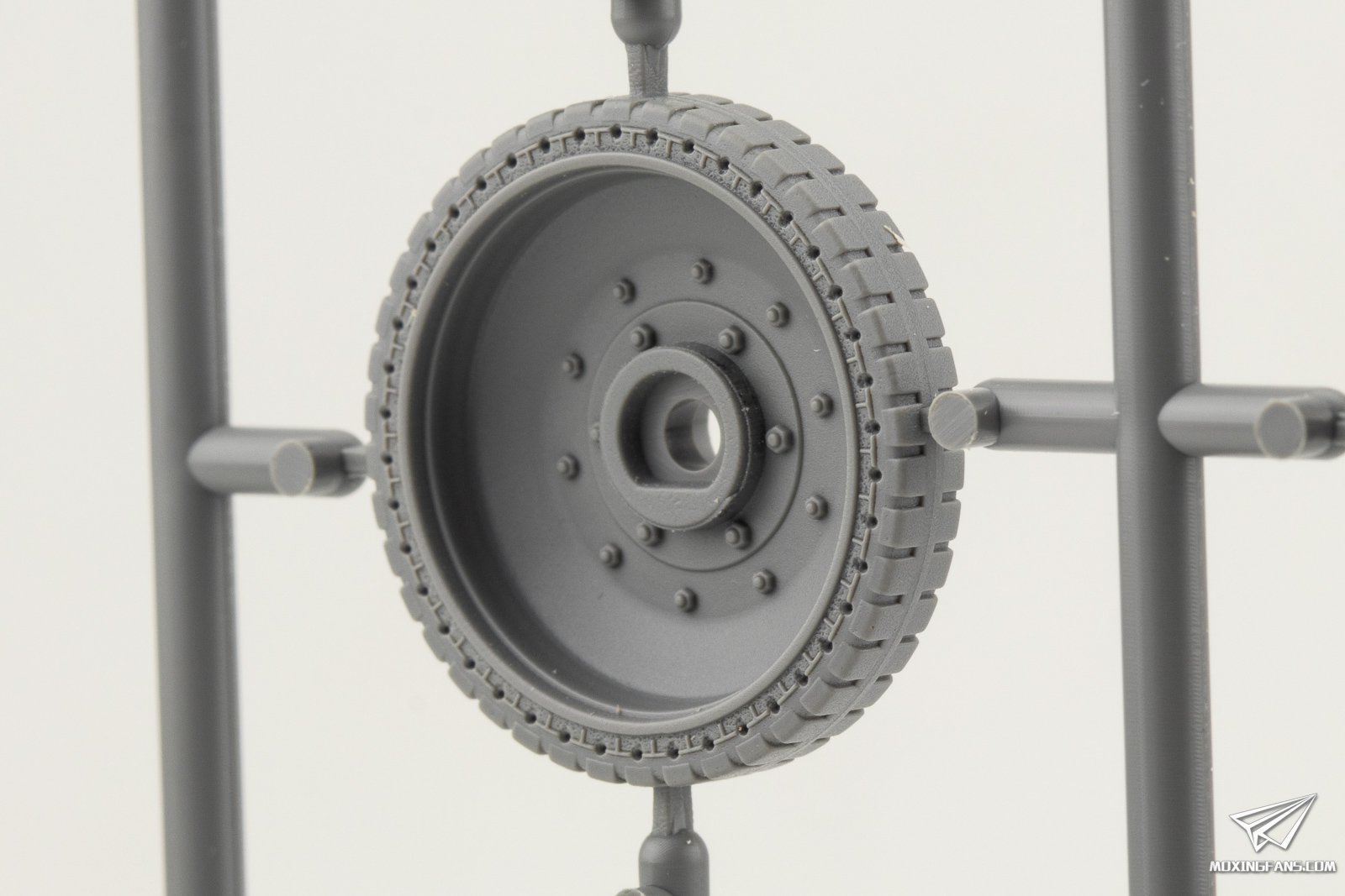 ▼ 负重轮的和轮轴盖的细节。负重轮的螺栓细节同样锐利,而且橡胶圈的花纹开的也很漂亮。更加值得一提的是,套件甚至还原了车辆因为长时间行驶,靠近钢圈的内层橡胶层的松散感,这个细节还是第一次见到有厂商开出来。