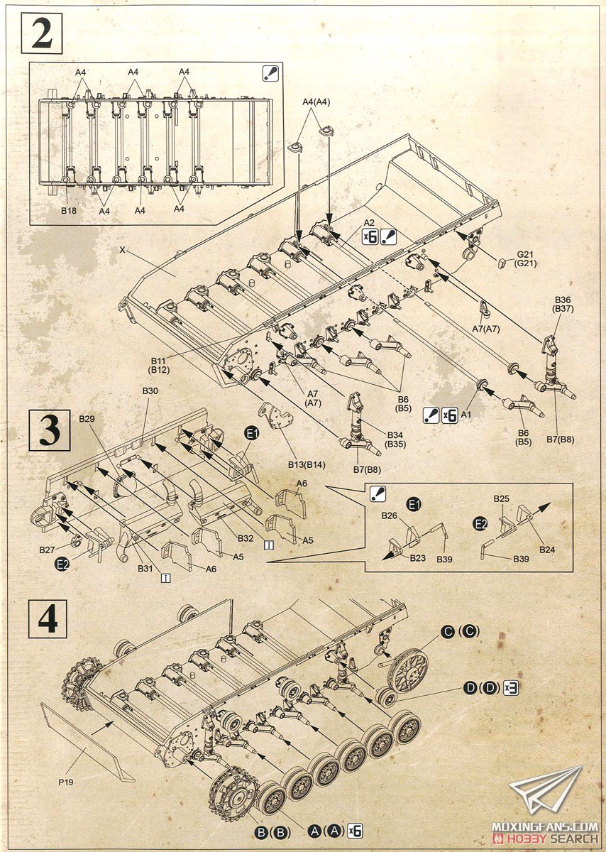 DAS-WERK的这款二合一的三号突击炮在日本上市了,HOBBYSEARCH放出了板件图和说明书。从板件来看,这盒套件除了履带部分以外基本算是6454的翻版,只是将后者的魔术履带换成了威龙新开的半拼接履带。而且对原来的蓝色部件进行了重新规划,做成了二合一。水贴和涂装为重新设计,蚀刻片为6320附带的SK版三号突击炮基础蚀刻片。这是一盒附带华夫饼干防磁装甲的三号突击炮,威龙的华夫饼干三突开的还是很漂亮的,如果手里有威龙6633和6454的模友会很熟悉,如果没有的话可以考虑一下,但是价格并不十分友好。 板件图和说明书如下(转载自HOBBYSEARCH):