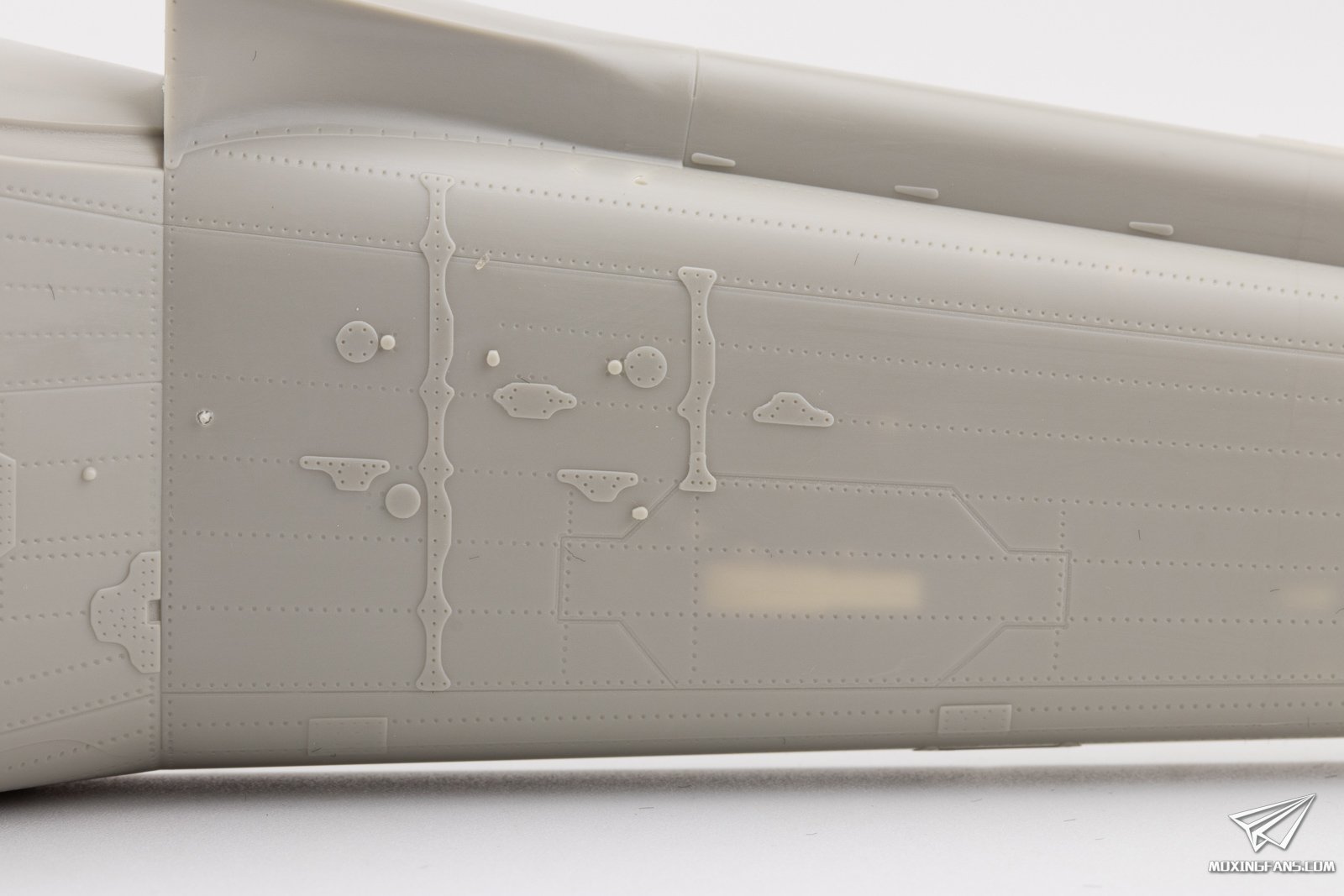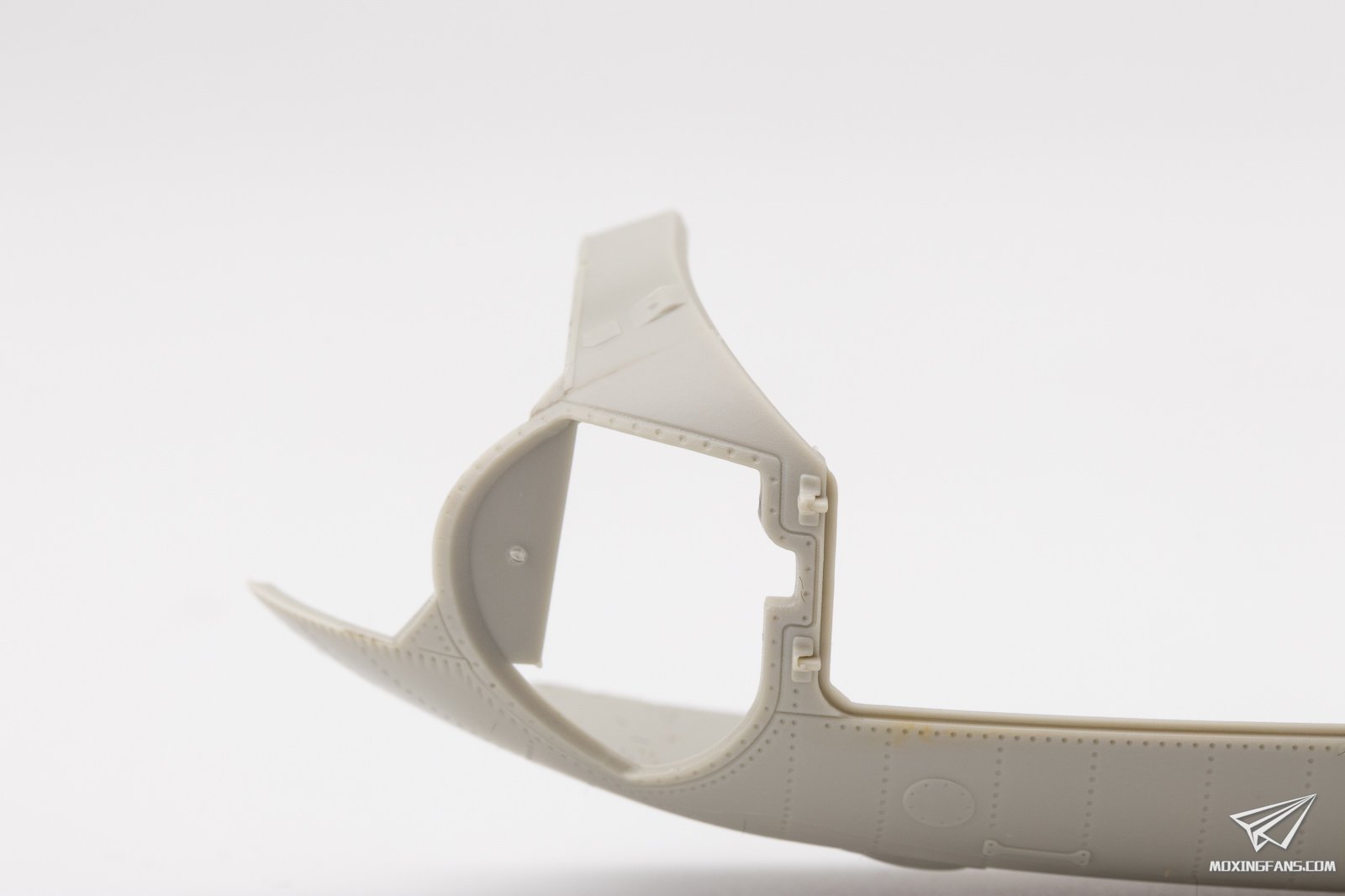 ▼ 首先来看机身的开模。巨大的机体使用传统的两片式开模,凹钉凹线设计,总体来说钉线的表现还比较工整,但是在圆弧拐角处的钉线细节有变浅的情况,在制作时需要自行加深。