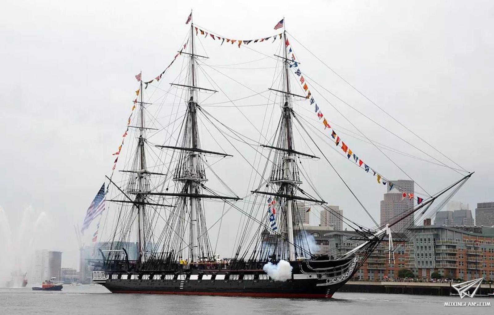 宪法号历史: 美国的护卫舰宪法(Constitution)号由美国首任总统华盛顿命名,舰名是为纪念于1789年生效的美国宪法。护卫舰宪法号是美国海军的超级护卫舰(super frigate),被分类在44门炮的那一级舰中,拥有两层全装炮甲板和较多的加农炮,以及存活性坚韧的橡木船壳版,因此被取了“老式铁壳船”(Old Ironsides)的绰号。 美国“宪法”号风帆护卫舰,别名“老铁壳”(Old Ironsides),是19世纪美国第二次独立战争时期最有名的一艘战舰,它被美国海军视为拼搏和胜利的象征。曾参加过多次海战,从未败过。 1794年3月27日,美国国会授权建立由六支军舰组成的国家海军,用以保护美国的商船不受海盗和英法海上武装船队的骚扰和欺辱。六艘军舰分别在不同的地方建造,其中的一艘受命在波士顿的埃德蒙特·哈特造船码头动工,这就是“宪法号”。此舰建造所用的木材,采自北到缅因州,南到佐治亚州的1500棵大树,而火炮则在罗德岛州铸造,称得上是倾全国之力而成的舰。“宪法号”风帆护卫舰1797年下水,1798年7月22日开始服役,巡逻于西印度群岛。 1803年,被时任总统托马斯,杰斐逊派至地中海参加第二战队保护美国船只,以免遭受巴巴利海盗的攻击,曾炮轰过的黎波里。 1805年7月,美国与的黎波里在“宪法号”风帆护卫舰上签订和平条约。 1812年8月19日下午,美国与英国在波士顿外海600海里处开战。“宪法号”风帆护卫舰与英国军舰HMS Guerriere号遭遇,这一场海战,美舰死亡14人,英舰死亡79人,后英舰因受创严重而沉没。同年12月29日,宪法号又在巴西外海30海里处,遭遇英国军舰HMS Java号,这一场海战,美舰死亡34人,英舰死亡150人。这是宪法号服役期间最重要的两场光荣胜利海战。