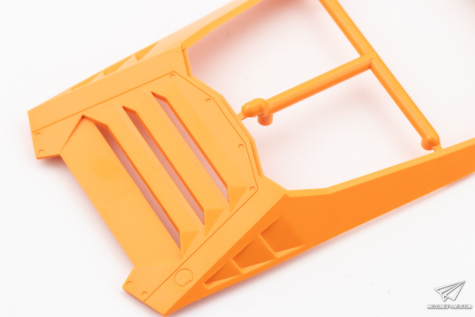 ▼ 车辆的造型非常科幻,主体为橙黄色,加装的装甲部分为深灰色。整体开模非常犀利,零件的锐利程度表现的很好,而且大量零件使用了滑块一体式开模,组合起来会比较顺畅。值得一提的是,车尾的排气管部分存在一些飞边现象,虽然处理起来并不麻烦但是却影响了制作的流畅度,希望厂家能够注意。