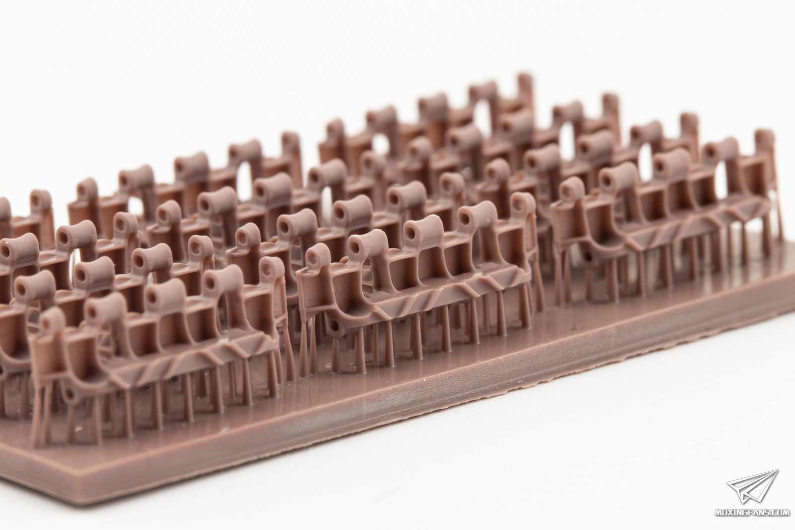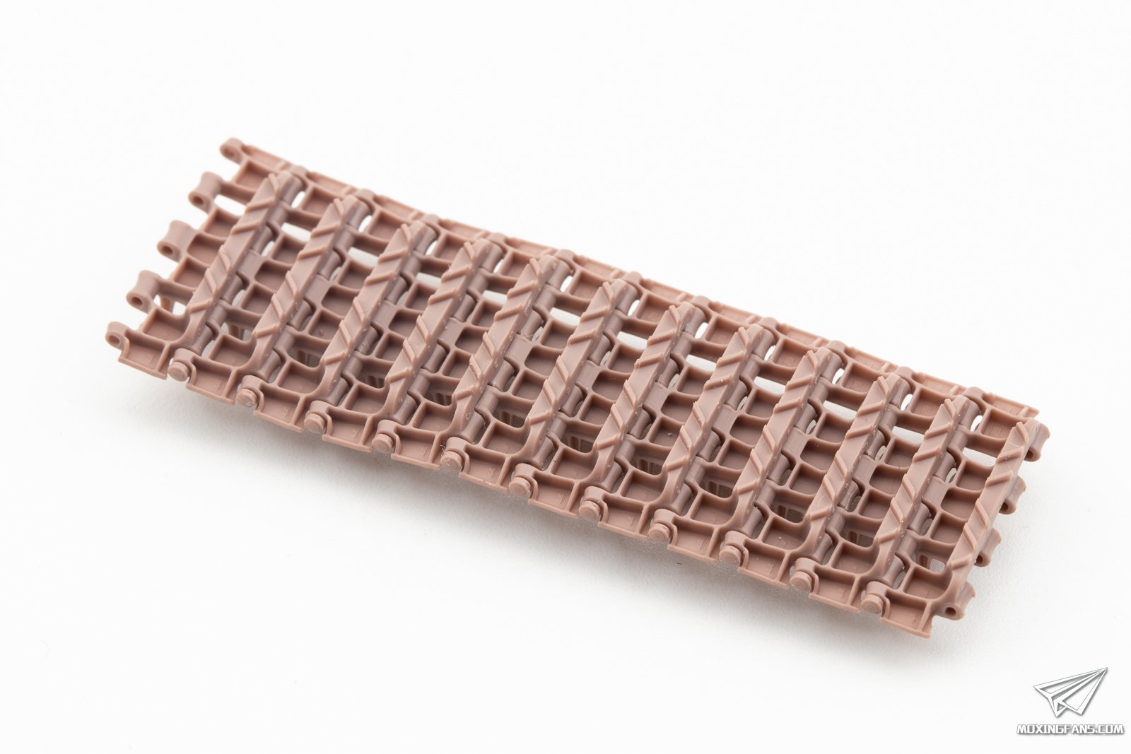 ▼ 因为是3D打印部件,所以并无需担心射出件常见的推出孔问题,也无需担心金属铝带常见的履带轴孔不贯通的品控问题,履带的细节和锐利程度表现的非常出色,请注意红圈内的微小的铸造编号细节。因为是精度比较高的红蜡打印,所以低端3D打印常见的横纹现象并不明显,跟常见的射出件表现没有明显差别。