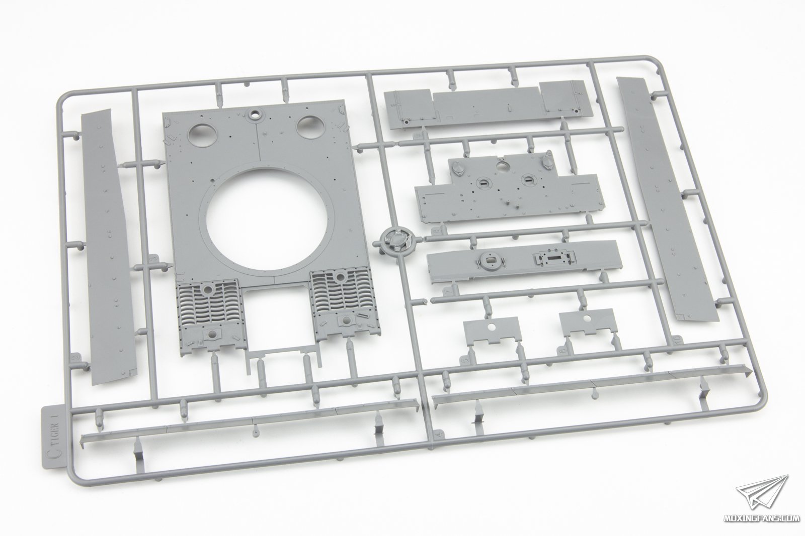 边境模型(BORDER MODEL)的这款虎式坦克在去年10月份预告之后就成为了热点,后期由于上市比较匆忙所以因为种种原因出现了一些瑕疵,成为了模友们讨论的对象。后来厂家推出了一系列的补件服务,对出现的问题进行了补救,即使如此这盒虎式在这段时间内也是舆论的焦点争议不断。 ▼ 如今这盒虎式最新版的样品到货,我们一起来看下这盒神秘的虎式表现究竟如何吧。板件为深灰色PS塑料,配有2片蚀刻片,金属炮管和金属烟雾弹发射器,特典为铁十字勋章。