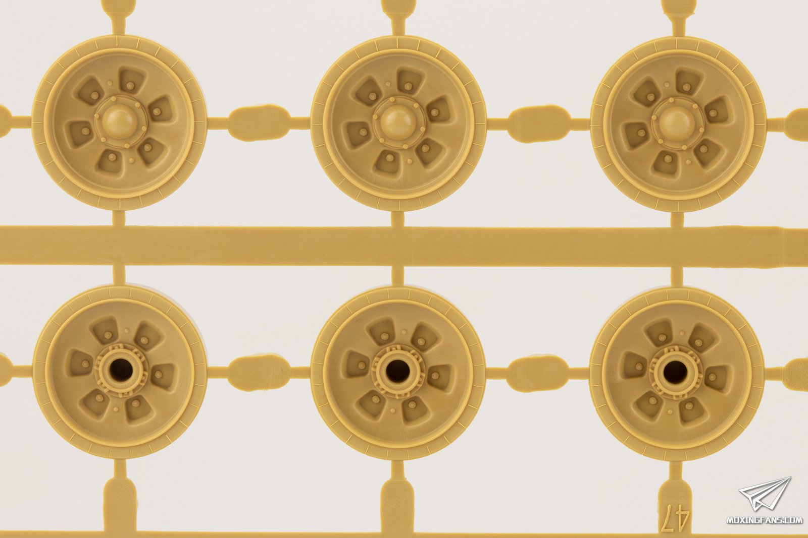 ▼ 车轮部分,负重轮侧面橡胶圈开出了纹路,无合模线,每个轮子4个水口,主动轮和导向轮水口的位置比较合理。