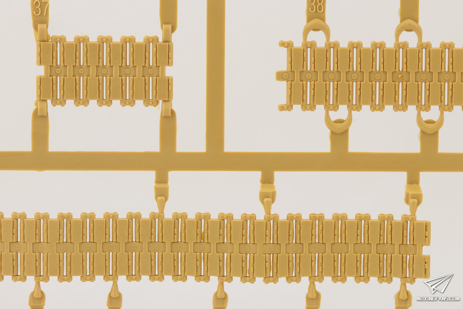 ▼ 履带方面给出的是半拼接履带,正面有些许推出孔。整体开模的履带不但给出了下垂感,而且一体化程度极高,每侧只有2片履带板单独开模,其余都是多片一体式开模,全部已经预制好了弧度,组合起来更加无脑。毫无疑问这样的开模方式会极大的简化组合过程,即使新人也能轻松完成,比传统的半拼接更加高效,但是带来的弊端就是弧度较大的几片履带板可能会出现诱导齿变形的问题。因为这些弧度较大的履带大都是在主动轮或者导向轮处,所以这种变形的问题对成品来说影响不大,个人认为是可以接受的。