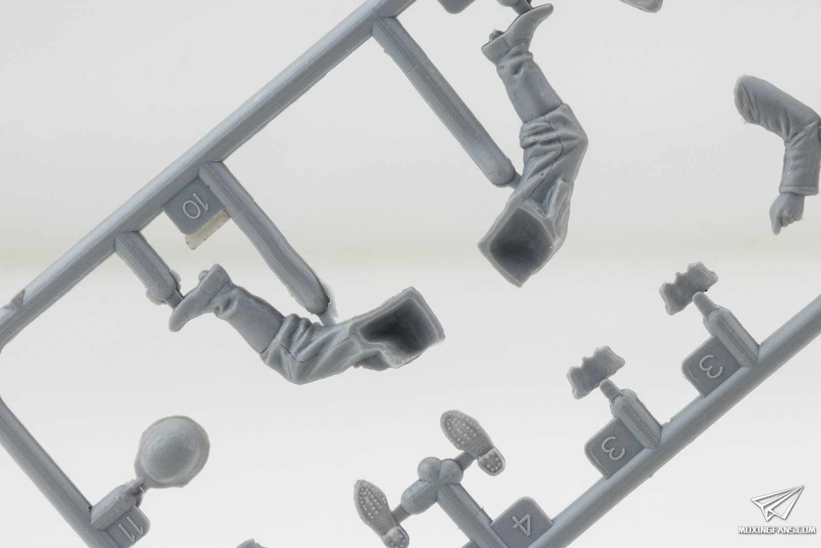▼ 兵人的细节。相对于近些年大厂推出的兵人来说细节方面有所不及,衣服的褶皱等细节较少较模糊,分件较为精细,鞋底都是单独开模。这几板兵人板件的飞边较多,需要仔细处理。