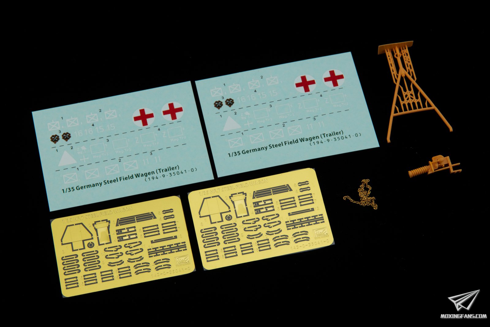 德国军队在机械化运输方面的进程是非常缓慢的,当二战开始时许多二线部队仍在使用马拉的交通工具。StahIfe Idwagen Hf. 7 (钢制野战车辆) 就是个典型的例子,它于1939年被 采用,而且还发展了几种款式。这只是一台约1吨重设有四个铁包轮子的简单非自动的钢壳车辆,它需透过两匹马匹所拉动并有1.5吨的负载能力。这种载具非常适合在西欧使用,但在环境过于糟糕的俄罗斯前线却让许多马匹死亡。经常不得不增加到4至6匹的马队才可去拉动它。Hf. 7在1939- 45年间大部分是供步兵师作为供应品运输所使用。Hf. 7设有牵引挂钩让它可被其他机动车辆所拖曳。由于Hf. 7被认为是过重及成本过于昂贵,因而后来被条件更佳的1吨木制车厢型所取代。 ▼ 看过昨天评测的模友们应该都能猜到了,这款套件就是在昨天的RV35043中选择了拖车部分重新包装,同时还提供了3D打印的车辆连接部件。
