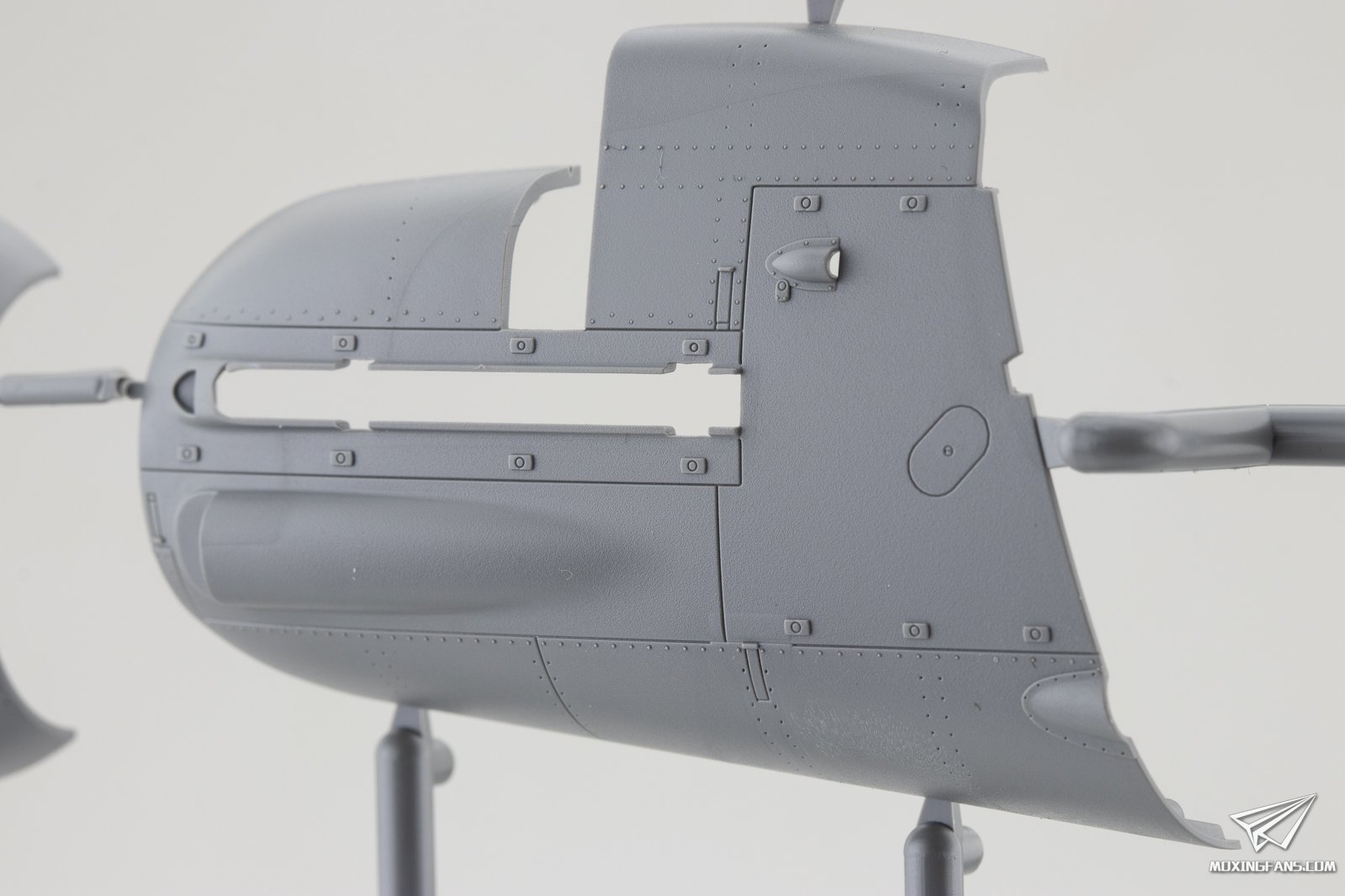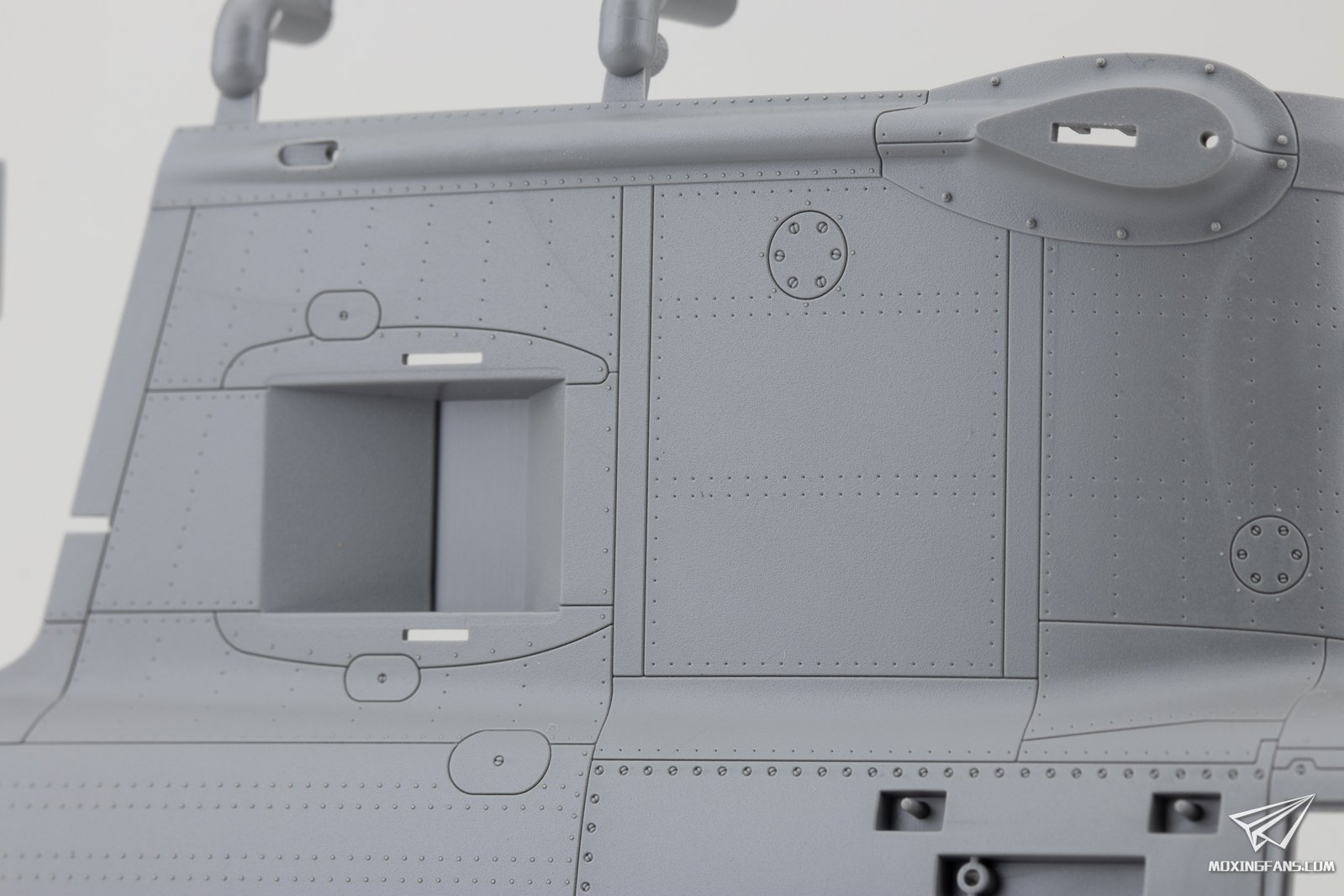 ▼ 机身为传统的两片式开模,凹线和凹钉表现较为犀利,而且这次的机体表面并非纯凹钉,机身后半部分个别地方和检修口则是采用了凸钉表现,效果一样犀利。