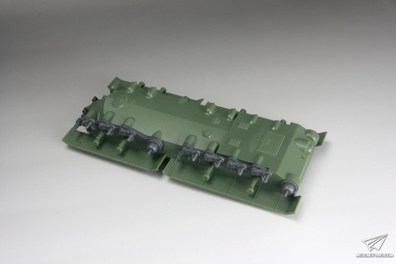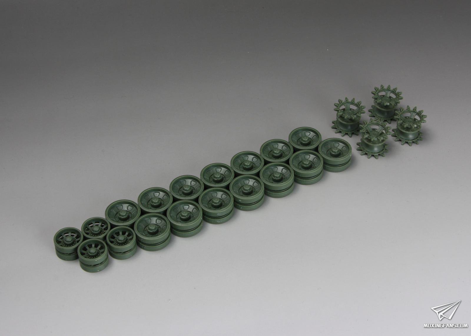 先从底盘开始总装。 天启的底盘比较有特色,两段式车体,各自独立的驱动轮、被动轮和履带,悬挂摇臂有定位孔,装上去还是比较紧的,建议不要使用腐蚀性强的胶水了,比如田宫速干溜缝胶,点上去八成得裂开。