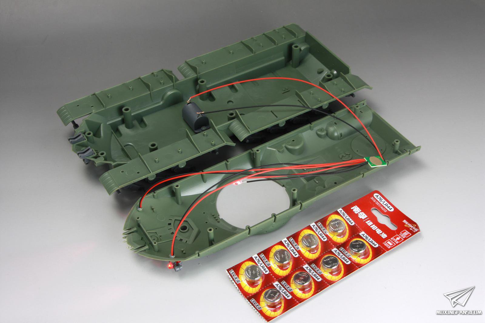 本套件自带的发光系统,分别对应了车体前部的车灯和炮塔顶部车灯。组装过程比较简单,按照说明书安装即可,需要注意的是,LED灯珠需要穿过车体直接嵌入前车灯,电池盒部分恰好处于炮塔座圈的中部,方便更换电池,发光灯组需要自己购买LR44电池,两颗即可,开关为触碰式开关,不管是正面还是反面,手指接触即可点亮或关灭灯光,由于发光效果显著,光会穿透塑料灯壳,建议喷涂时黑色使劲打底封住灯光后期才不会穿帮。
