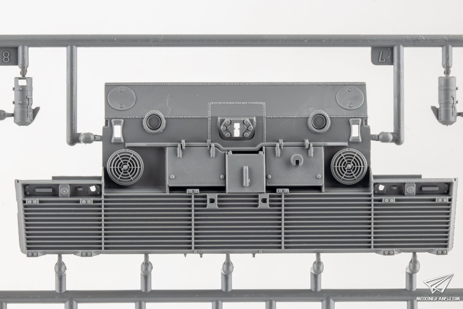 ▼ 上车体的舱盖,侧裙甲等零件的细节。油料加注口舱盖上开出了微小的铸造编号细节,尾部的发动机进气口采用射出件加蚀刻片的方式表现,侧裙甲为新开模,尾部有镂空结构。